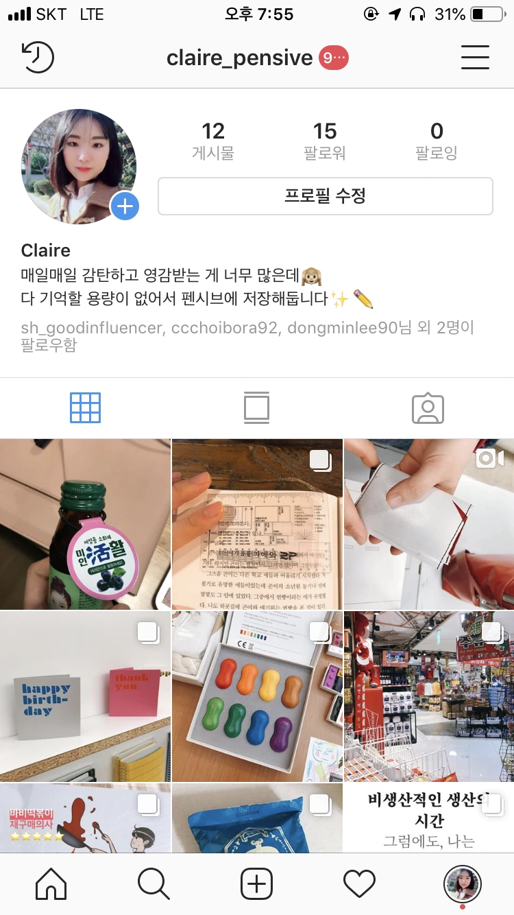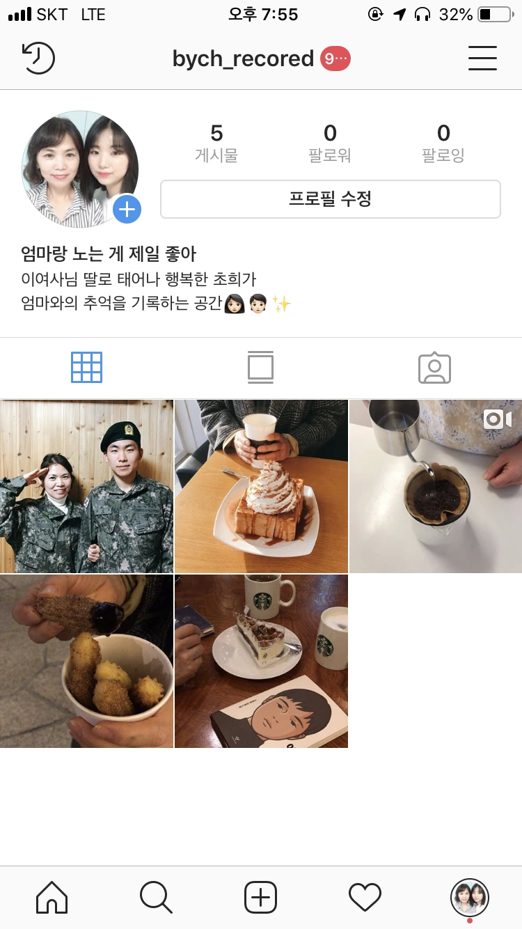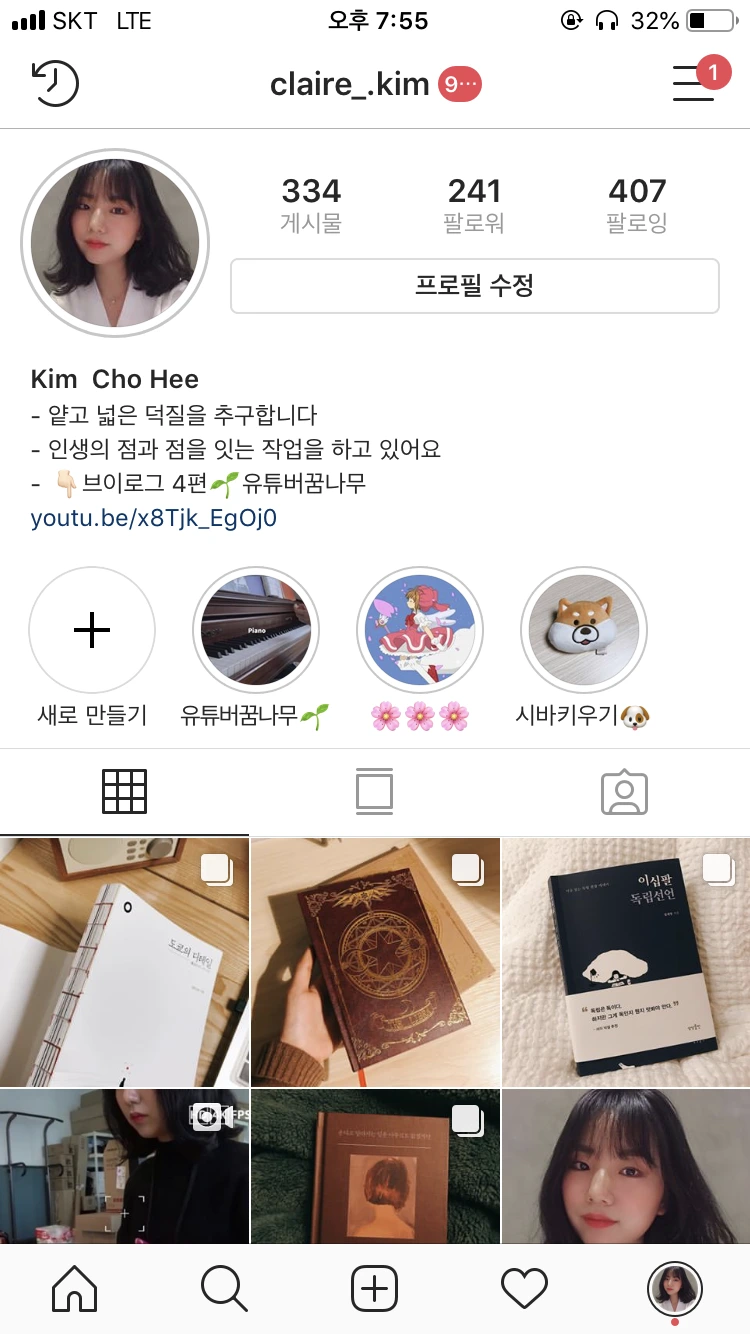 총 3가지 용으로 사용한다. 첫 번째는 습관형성. 꾸준히 책을 읽고 싶으면 #14일의북터디 라는 해시태그와 함께 책 인증 사진을 올린다. 그림을 꾸준히 그리고 싶으면 그림 계정을 판다. 인스타그램을 관리하고 싶은 마음에, 사람들에게 자랑하고 싶은 마음에 꾸준히 기록을 하게 된다. 두 번째는 내 프로젝트를 홍보. 작년에 텀블벅에 맥주컵을 팔았을 때 텀블벅 링크를 프로필에 심어 지인에게 홍보하기도 했고, 이번에 유튜브 채널을 개설해서 유튜브 채널로 유입시키기 위한 수단으로 활용하기도 했다. 세 번째는 내 일상이나 잡생각들을 쫑알쫑알 씨부리는 용도. 간단한 텍스트와 사진만으로 콘텐츠가 되니 참 편리하다.