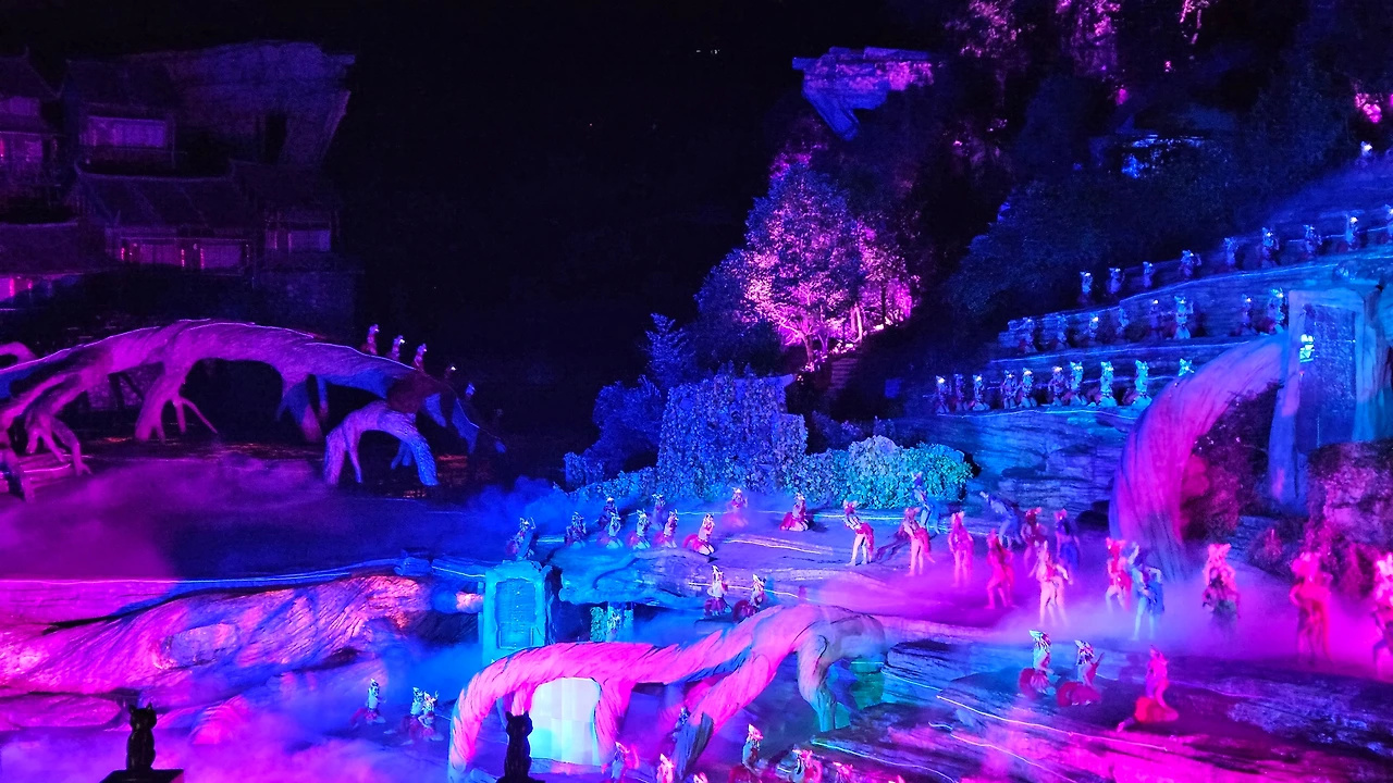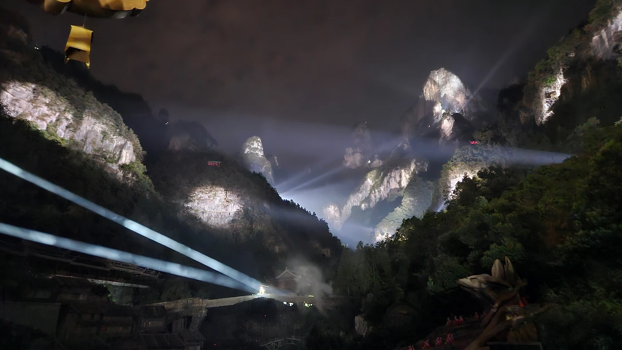 천문산을 다녀온 사람들이 다들 사진을 찍는 스팟에서 사진을 찍고 나서 일정이 끝인 줄 알았건만, 저녁을 먹고 할 게 또 있단다. 아까 구글 카메라로 검색한 여우가 어쩌구 뮤지컬인 ‘천문호선쇼’를 보고 나야 오늘의 일정이 끝난다고 한다. 패키지로 간 덕분에 무리 없는 한식으로 저녁을 먹고, 세상 저렴한 칭따오 맥주에 연태고량주를 타서 한 잔씩 마시며 이것이 중국이로구나 한번 더 느끼고 나서, 어두워진 천문산 초입으로 다시 올라가 새삼 조명이 화려해진 공연장 앞에서 세상 화려한 메이크업을 하고 있는 여우 언니들과 사진을 찍고 공연장으로 들어갔다. 영험한 구미호(그런데 이제 약혼을 한)가 자신을 구해준 착한 마을 노총각과 사랑의 도피를 하면서 벌어지는 갈등을 극복하고 종족과 시간을 뛰어 넘어 천년의 사랑을 완성한다는 단순한 이야기를 무려 천문산 전체를 배경 삼아 500명의 배우가 그려내는 공연이었다. 한나절에 걸쳐 관광했던 천문산의 경관을 새삼 무대 배경으로 사용한 것과 홀로그램을 적절하게 사용한 점이 인상적이었다. 보통 공연이라고 하면 남녀주연은 각 한 명씩이지만, 이 공연은 무대가 너무 거대한 나머지 노래하는 사람은 따로 있고, 주연의 옷을 입은 여러 명이 도처에서 각각 튀어나와 연기를 하는 형태였다. 어릴 때 마당극 같은 것을 본 적이 없어서 이런 공연은 어떤 장르일까 생각했었는데, 최근 드라마 ‘옥씨부인전’에 나오는 천승휘의 무대가 비슷한 느낌이다. 그런데 이제 스케일이 매우 거대하고 출연진도 엄청 많은. 천문호선쇼가 끝나고 드디어 처음으로 캐리어를 꺼내 호텔 체크인을 하고 나니 밤 11시였다. 호텔 사진을 찍을 체력도 없을 만큼 지쳤지만, 그날 침대에 자려고 누우니 천문산 케이블카를 타고 본 지층의 모습이 눈앞에 움직이며 펼쳐졌다. 내가 중국 여행을 오기는 왔구나, 생각하며 첫날밤 겨우 잠에 들었다.