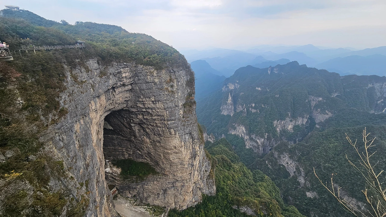 케이블카에는 8명이 탈 수 있었고 편도 탑승 소요 시간은 30분 정도였다. 중간에 케이블카 정거장이 하나 더 있었고, 총 두 번에 걸쳐 천문산 정상을 향해 올라갔다. 불과 몇 년 전까지 세계에서 가장 긴 케이블카였다고 한다. 나는 몇 년 전 미국 여행에서 그랜드캐년 투어를 다녀온 적이 있다. 그랜드캐년이나 호스슈밴드를 관광하는 하루짜리 코스였는데, 미국 국립공원 관광의 경우 대부분 넓은 전경을 멀리에서 보고 광활한 대자연을 배경으로 사진을 남기는 식이었다면, 중국은 국립공원으로 삼은 산에 올라가서 관광객이 가까이에서 볼 수 있도록 만들어 놓았다. 누가 철근을 박아 케이블카를 타고 올라갈 생각을 할 수 있다는 말인가. 그야말로 대륙의 기상이 느껴지는 관광 방식이었다. 천문산 외에도 대부분의 관광지에서 케이블카와 같은 편리한 수단을 통해 광활하고 거대한 중국을 여행할 수 있었는데, 같은 대협곡(grand canyon)이어도 두 나라는 그것을 대하는 자세에서 차이가 있었다. 덕분에 산의 지형을 매우 가까이에서 볼 수 있는데, 사방이 모두 절벽인 산세를 거대한 대성당에 놓인 수십 개의 양초 같은 봉우리들이 둘러싸고 있다. 석회암 지형인 카르스트 지형이라고 한다. 아늑한 느낌을 주는 우리나라 산들과는 전혀 다른 느낌이었고, 설악산의 울산바위가 깜찍하게 느껴질 지경이었다. 확실한 것은 장가계의 산들은 그 어디에서도 보기 힘든 느낌이었다.