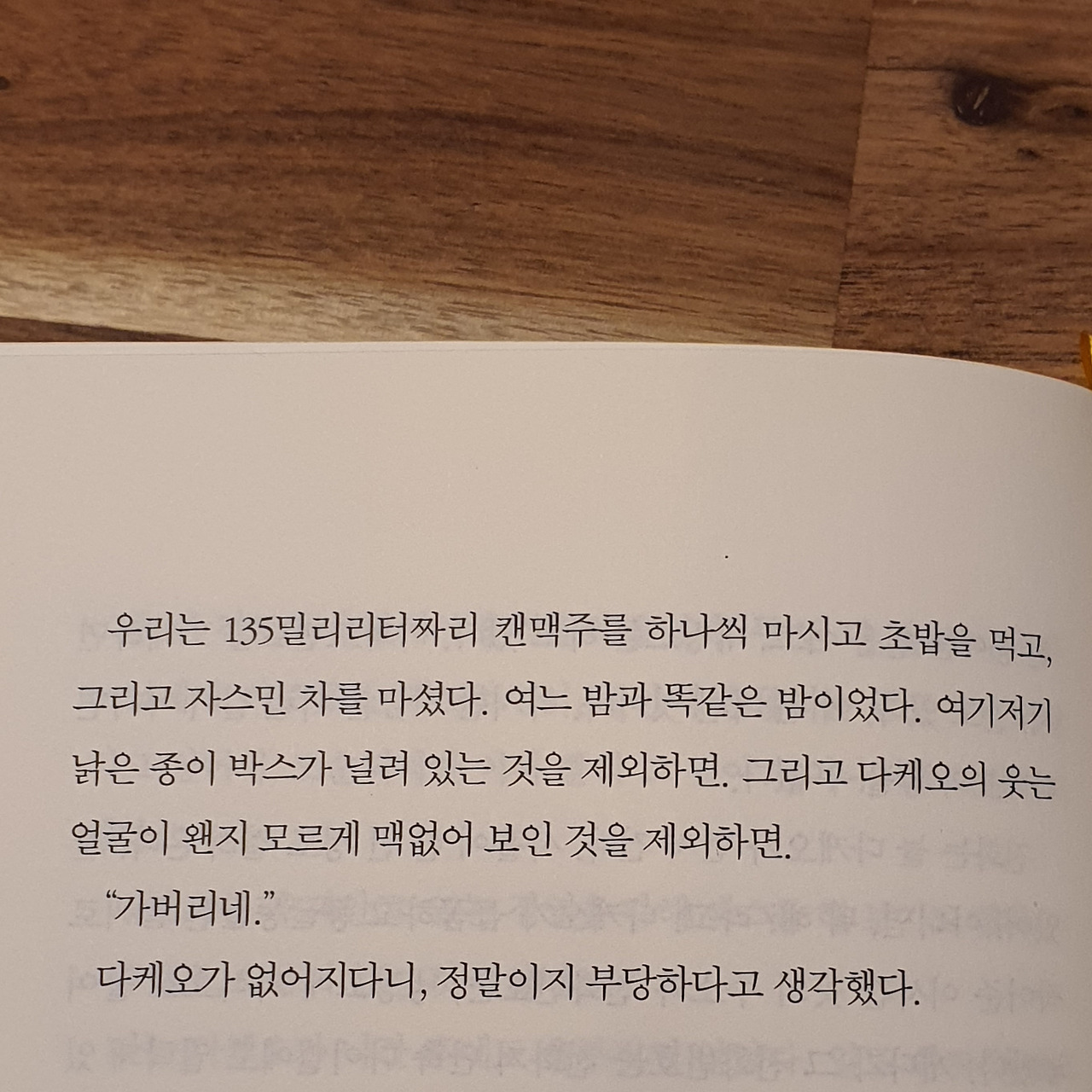 소설의 첫 부분부터 평소와 다름없이 데이트를 하며 나른한 주말을 보내는 커플이 등장하는데 거기서 내 마음에 먼저 들어온 것은 남자가 담담하게 이별을 고하는 장면보다 두 사람이 그 길로 집으로 돌아가 맥주와 초밥을 먹는 장면이었다.