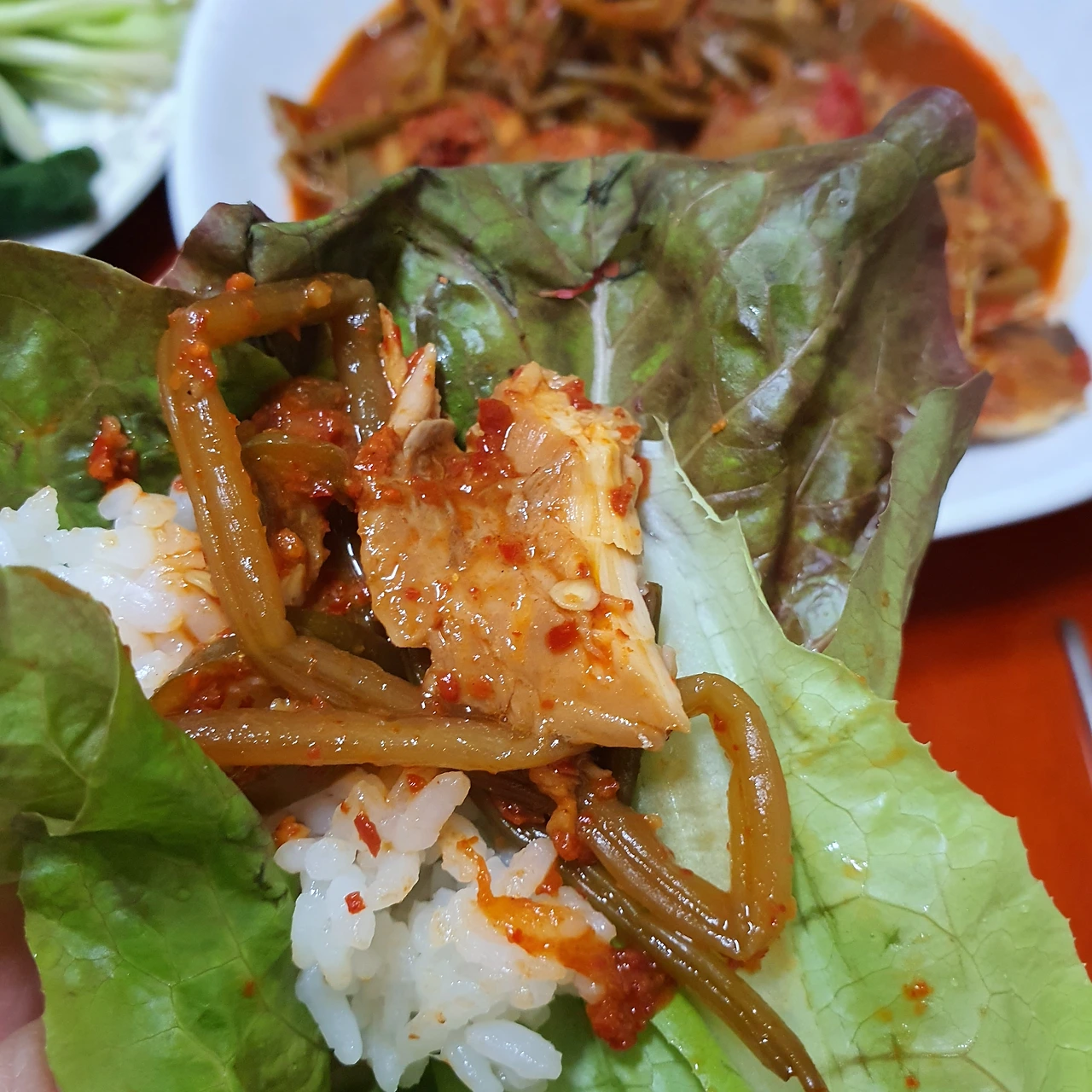 밥상의 메인 메뉴는 고구마순을 넣은 고등어조림이었다. 호박잎과 상추까지 준비해서 김이 나는 뽀얀 쌀밥 한 숟가락에 가시를 잘 발라낸 고등어 살과 몇 줄기의 고구마순을 올려 쌈을 싸 먹는데 진짜 어디 가도 이런 고등어조림은 못 먹을 것 같다는 생각이 들 정도로 기막힌 맛이 입 속에 가득했다. 엄마는 "고등어가 참 좋제. 고구마줄기도 부드럽고." 말했고 나는 그 말에 "나는 뭐가 좋은지는 잘 모르겠고 그냥 이 자체로 맛있다." 하고 대답했다.