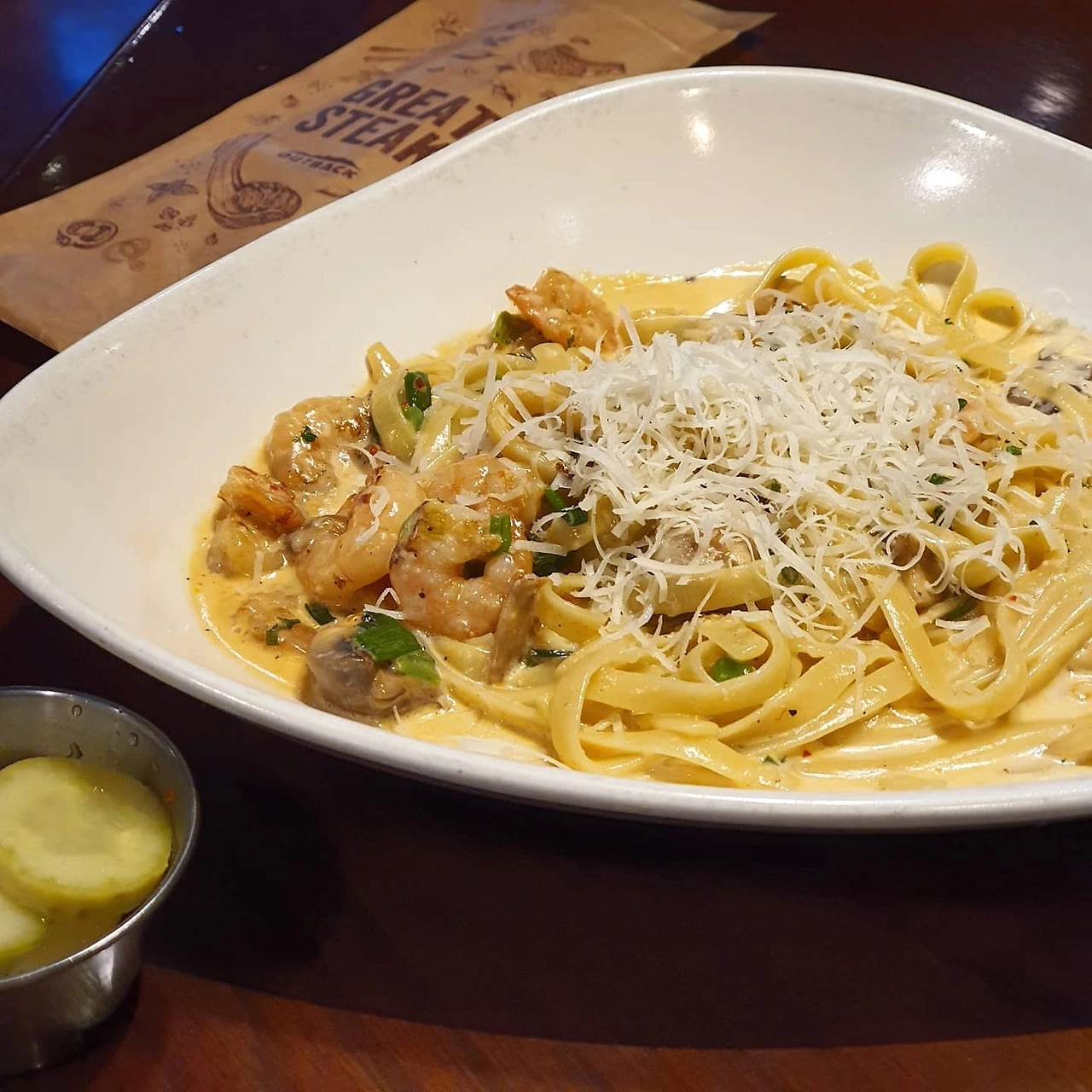 아무튼 나는 앉자마자 1년에 한두 번씩 먹던 대로 투움바 파스타, 양송이 수프, 오렌지 에이드를 선택하고 기다렸다. 3분도 채 지나지 않아 아웃백의 시그니처인 식전 빵 부쉬맨 브레드와 수프를 먼저 제공해 주셨다.