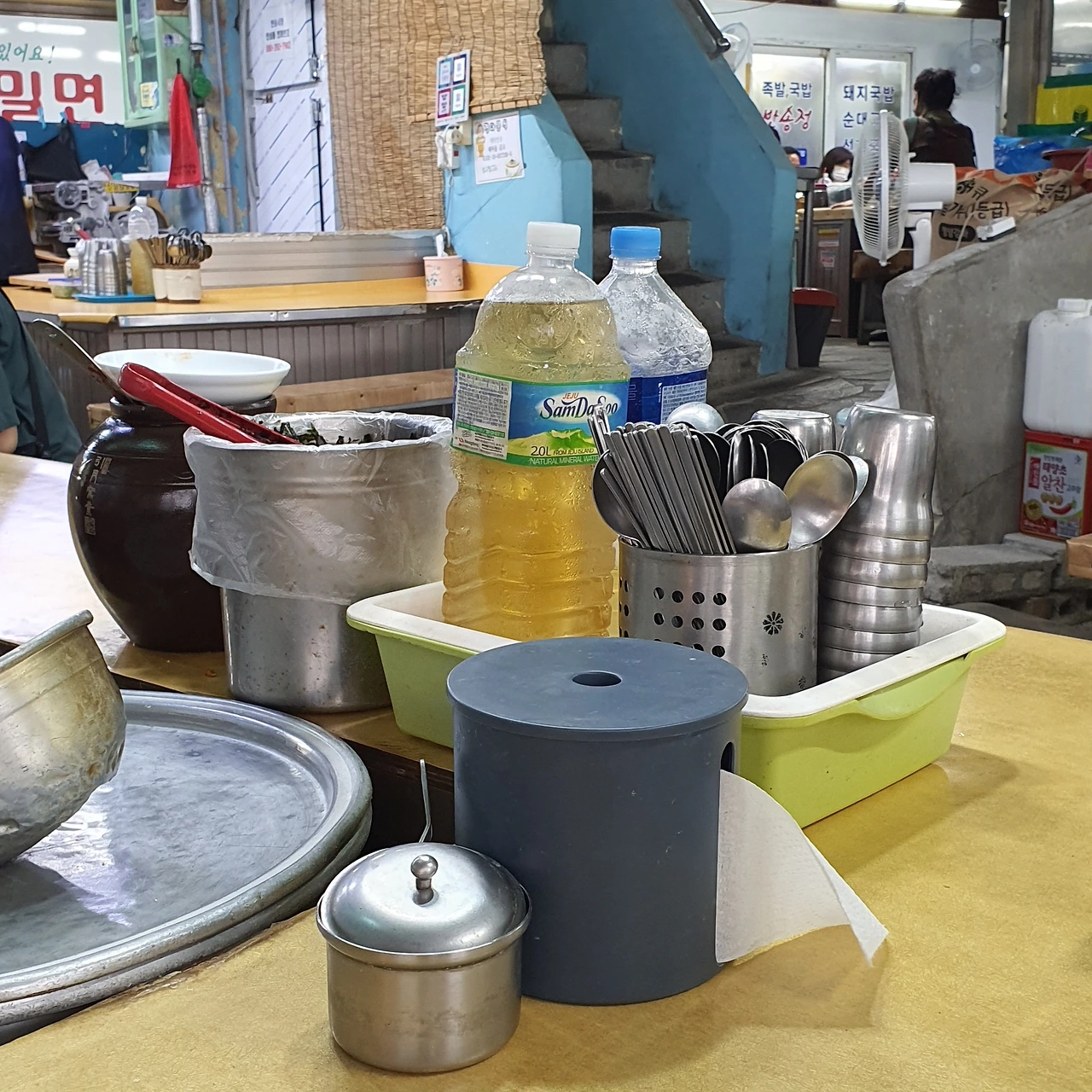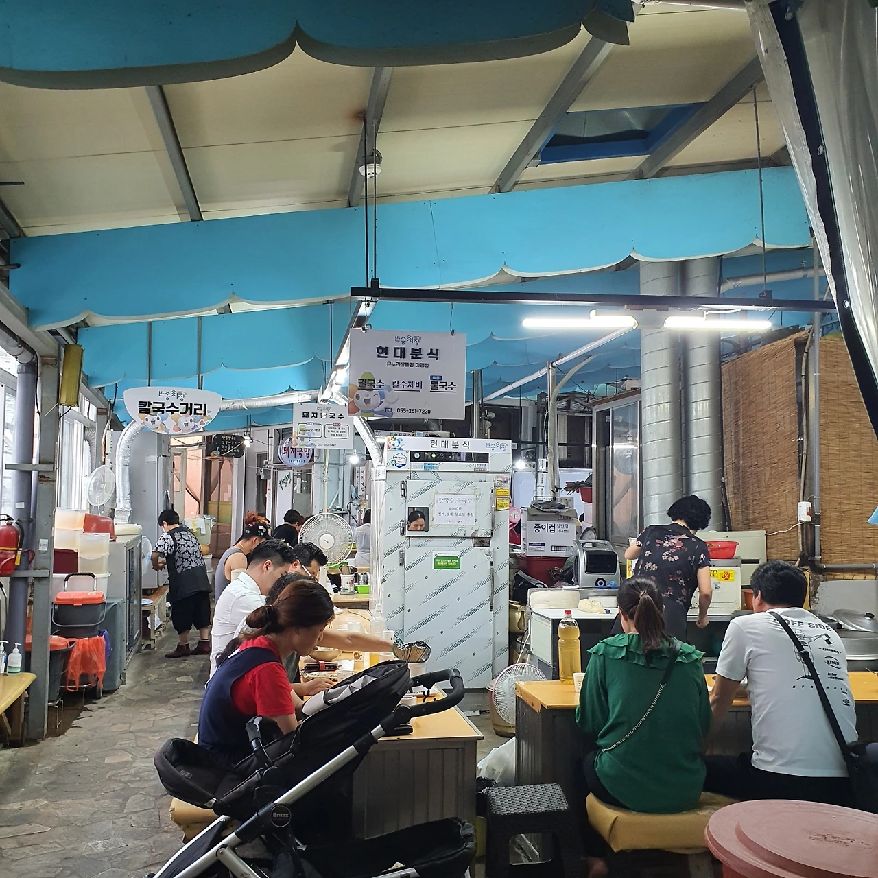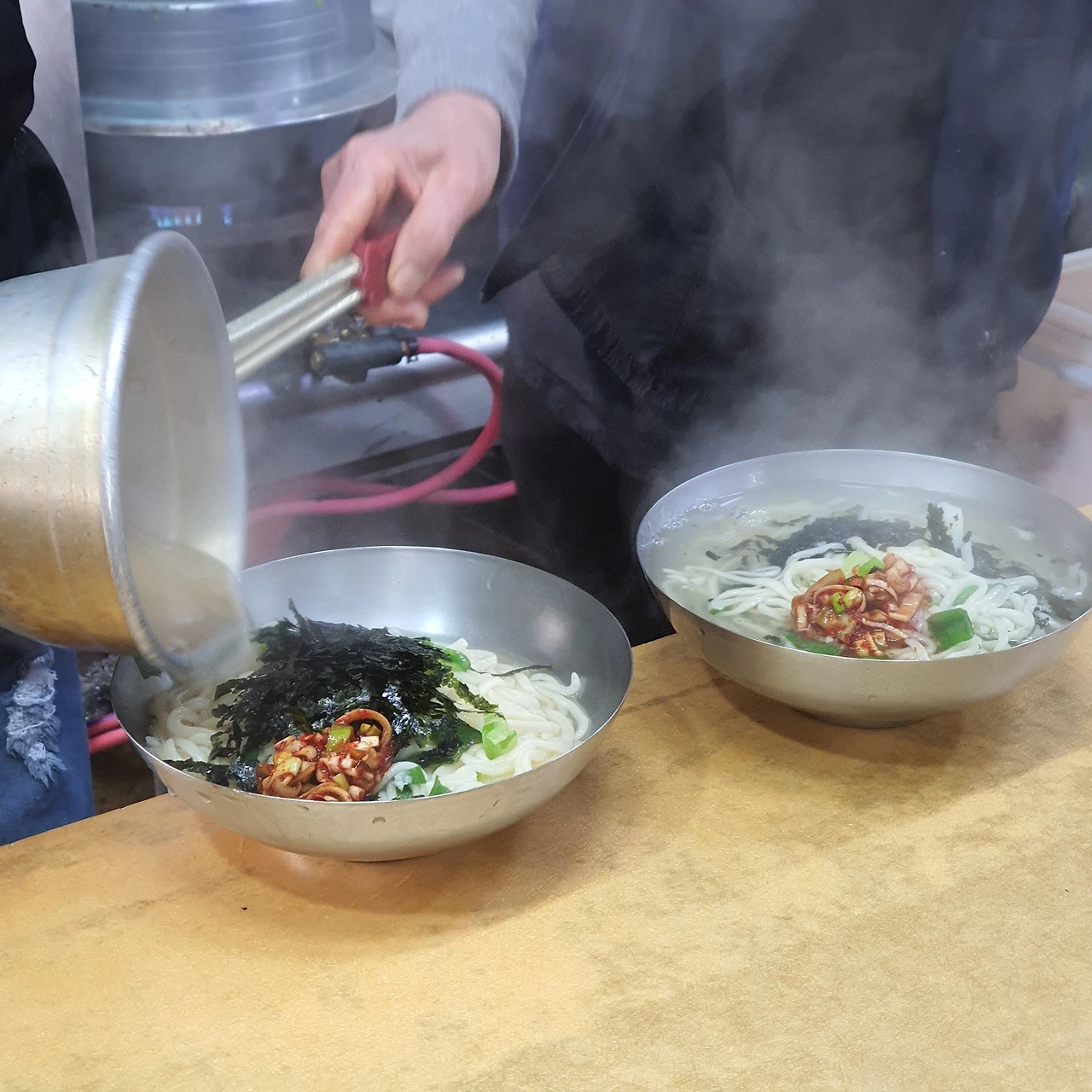 시장 안의 좁은 골목길로 들어설 때부터 육수를 담은 솥에서 모락모락 피어오르는 김을 볼 수 있다. 뜨거운 김을 볼 때 이미 콧 속으로 육수의 향이 들어온다. 삐걱거리는 나무 의자에 걸터앉으면 "어서 오이소. 뭘로 드릴꼬?" 주인장 이모님의 목소리가 귓속으로 들어온다. 엄마와 나는 동시에 "칼국수 2개요." 외친다.