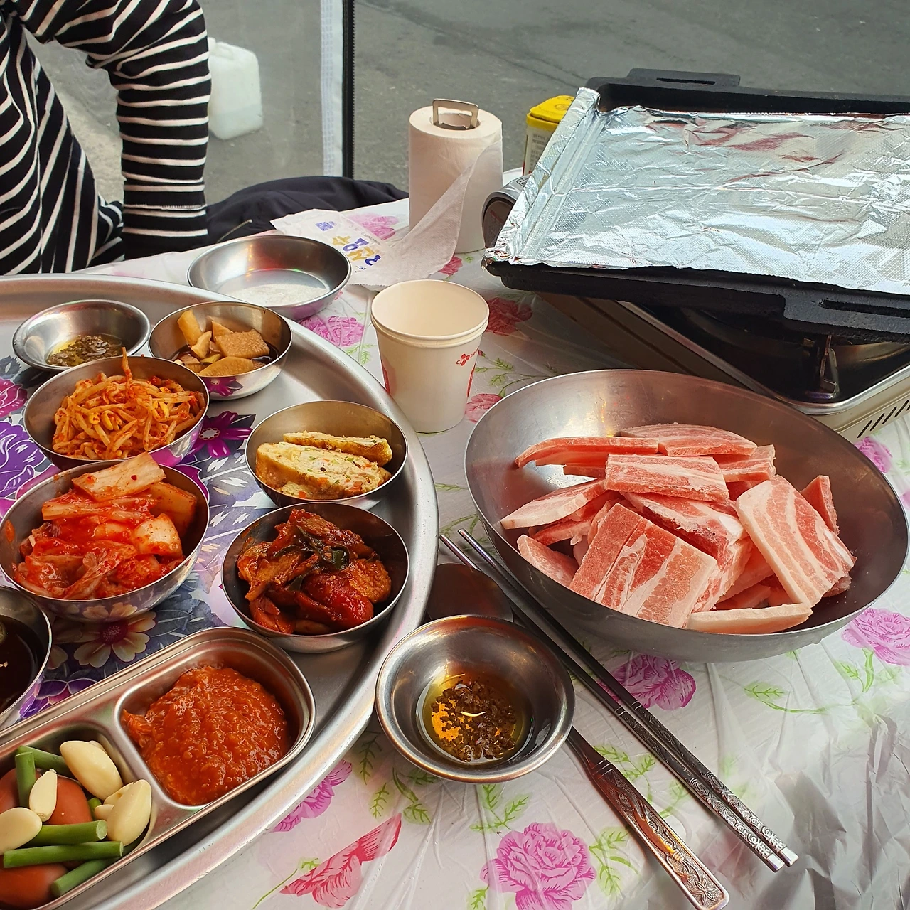얼마나 지났을까. 아까 전 상황과는 다르게 조용해진 것을 깨닫고 확인을 위해 쪼르르 달려가 문틈으로 밖을 쳐다보았다. 삼삼오오 동네 어른들이 모여 큰 불판 같은 데에다 고기를 굽고 계셨는데 곧이어 할머니가 문을 열고 "고기 먹자." 하며 나를 부르셨다.