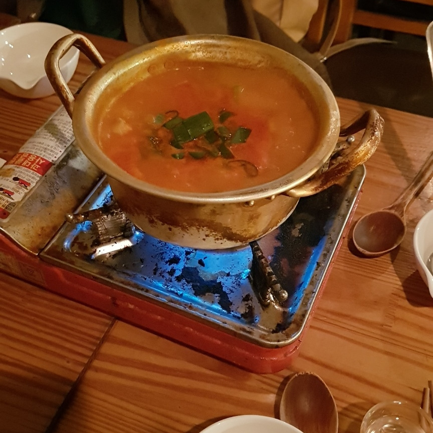 술이 먼저 나오고 기본 안주에 한두 잔을 기울이고 있으니 주문한 고추장찌개가 나왔는데... 맙소사! 투박하고 수수한 비주얼이 완전 내 스타일이었다. 자신의 역할을 할 대로 다 했다고 말하고 있는 것 같은 오래된 소형 가스버너 위에 마찬가지로 오래된 양은 냄비가 올라왔다. 냄비 속을 보고 있으니 뭐 특별할 건 없어 보였다. 다만 찌개가 끓으면서 나는 소리와 냄새는 침샘을 자극했다.