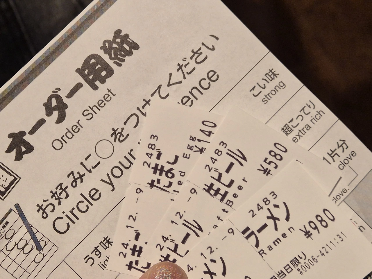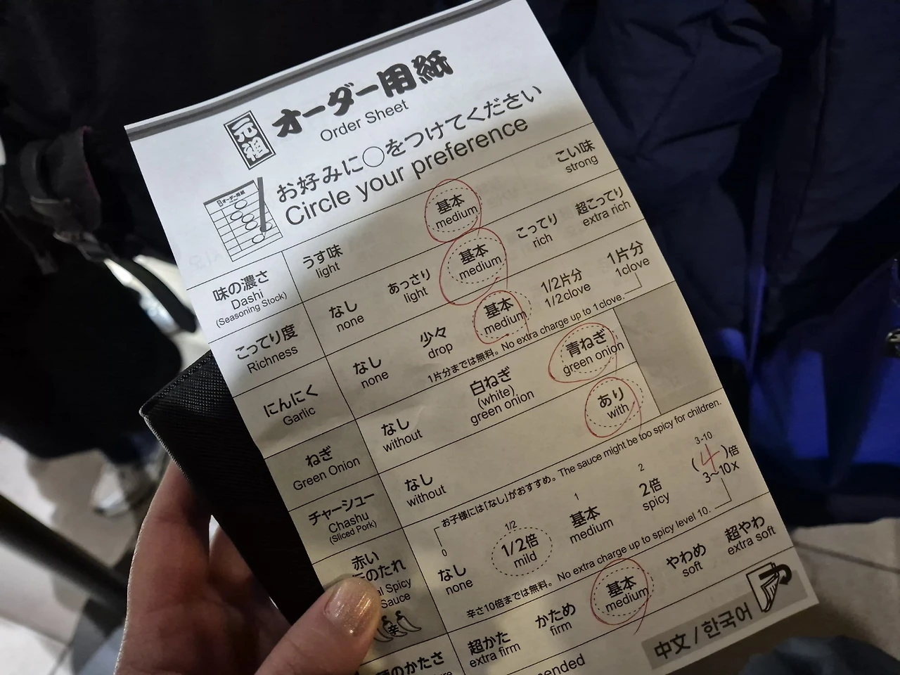 나란 사람은 웨이팅을 싫어하는 사람이지만. 그래도 라멘은 회전율이 좋은 데다 기다릴만한 대기줄로 보여서 기다렸다. 기다리는 동안 메뉴를 미리 고를 수 있도록 대기줄 맨 앞에서부터 뒷사람 또 뒷사람에게로, 그 옛날 시험지를 첫 줄 학생부터 넘겨서 받던 그런 모습으로 메뉴 종이와 펜을 건네받았다. 일본어와 영어로 되어 있는 선택지에 심혈을 기울여 원하는 곳에 동그라미를 쳐놓고 무심코 뒷장을 보니 한글로 된 메뉴가 그대로 있었다. 허무하게도. 한국인이 가장 많이 찾는 여행지답게도.