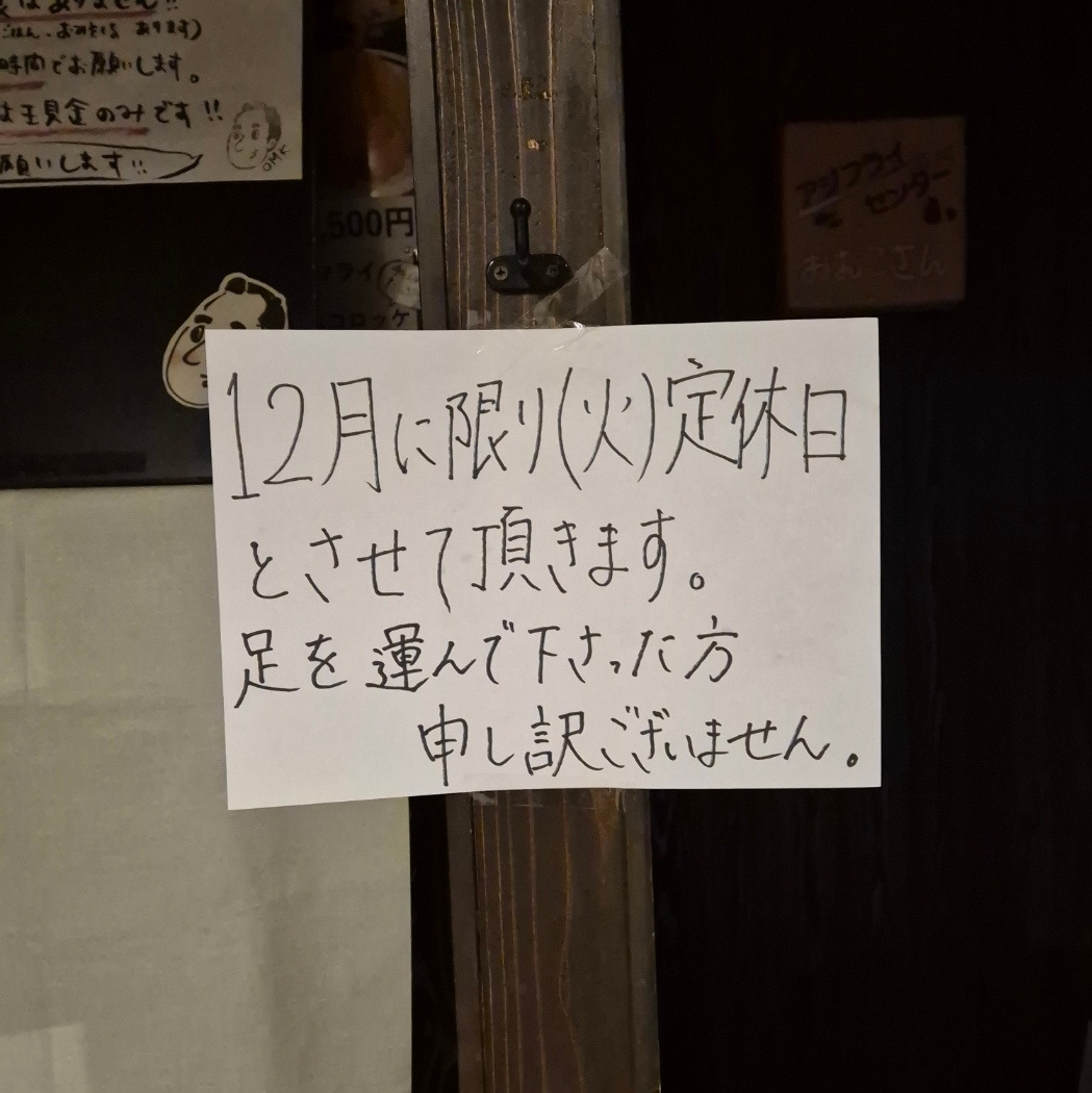 모츠나베를 포기하고 나니 떠오른 메뉴는 전갱이 튀김이었다. 수많은 일본 드라마에서 꼭 한 번씩 보던 메뉴지만 한국에서는 볼 수가 없던 메뉴. 그것을 먹기 위해 미리 알아봐 뒀던 전갱이 튀김 전문점으로 발걸음을 옮겼다. 그런데 말이다. 가는 날은 반드시 장날이다. 전갱이집 문 앞에 붙은 안내문을 읽고 실소를 금치 못했다. 분명 구글에는 영업 중이라고 떠있었는데 하필 그날 영업을 하지 않는다는 안내문이 붙어있었다.