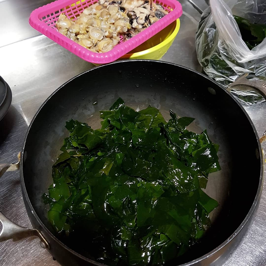 워낙 손맛이 좋은 엄마를 닮아서일까, 나도 어디서 요리를 하면 잘한다는 소리를 듣는 편이다. 엄마가 만드는 것만큼의 맛은 자신 없었지만, 그래도 나만의 방식으로 엄마가 만족할 만한 미역국을 끓여드리고 싶었다. 생일 전 날밤 불려놓았던 미역을 씻어 물기를 꽉 짜 먹기 좋은 크기로 잘라 냄비에 넣고 들기름과 함께 먼저 볶다가, 준비해둔 바지락 살과 홍합 살까지 넣고 다진 마늘과 함께 볶았다. 어느 정도 볶다가 이때다 싶을 때 물을 붓는데 (※여기서 '이때다'는 전국에 계신 어머님들의 요리 타이밍) 국간장을 넣고 팔팔 끓이면 미역국이 완성된다.