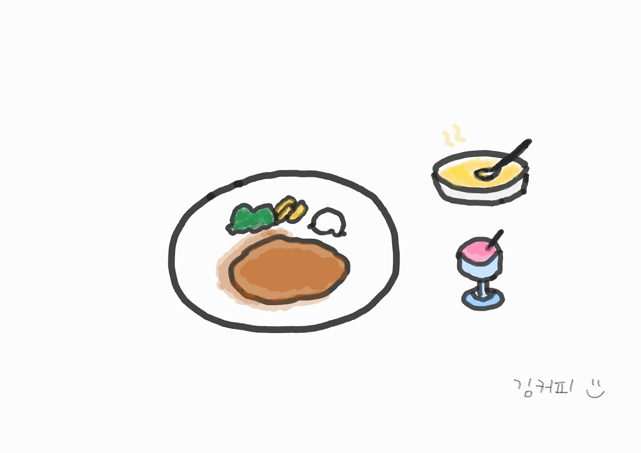 찰나의 정적을 깨는 목소리를 따라 앉을자리를 찾아 엄마와 마주 보고 앉으면 푸근한 인상의 아저씨가 주문을 받으러 오셨고 언제나 나는 돈가스, 엄마는 쫄면을 주문했다. 돈가스를 주문하면 먼저 넓은 접시에 수프를 가득 주셨는데, 나는 그때 수프라는 것을 처음 먹어봤다. 정말, 너무 맛있었다. 큰 숟가락으로 접시를 뚫을 듯 박박 긁어먹고 있으면 인상 좋은 아저씨가 메인 요리인 돈가스를 가져다주셨다. 배불리 먹을 수 있을 것 같은 두툼한 돈가스에 잘 튀겨진 색의 그것보다 더 진한 색의 소스가 얹어져 김이 나고 있었다. 따뜻할 때 얼른 먹어야 한다고 엄마는 돈가스를 재빨리 썰어 접시를 내 앞에 밀어주고, 엄마 앞에 놓인 그릇에 젓가락을 쏙 넣고 쫄면을 비볐다. 나는 보기만 했고, 먹기만 했다. 자주 먹을 수 있는 메뉴가 아니니까 천천히 눈에 담으며, 열심히 혼자 다 먹었다. 내가 만족스러운 포만감을 처음 알았던 건 아마 그때일지도 모른다. 만족의 배부름, 정점을 찍는 후식 아이스크림이 나오는 순간! 작고 차가운 볼에 담긴 딸기 맛 아이스크림을 설거지하듯이 야무지게 쓸어 먹었다.