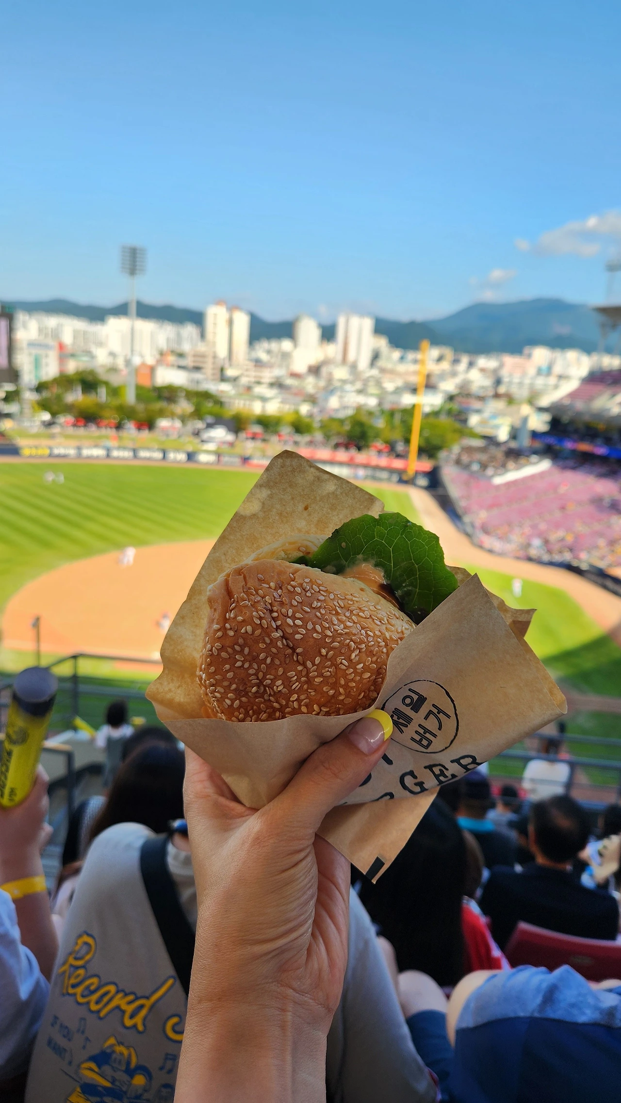 투수가 던지는 공도 봐야 하고 참견도 해야 하는데 두 손에 든 버거부터 해치워야 한다. 바쁘다. 삐져나오는 양상추와 패티를 빵속으로 살살 넣어가며 허기를 채우는데, 다 먹기도 전에 또 한 번 함성의 기회가 왔다. 8회 말 투아웃, 약속의 8회에 우리 팀 공격 중, 버거를 한쪽에 두고 일어났다. 역전 기회다. 호통이를 두 개로 포개서 2만 관중의 칼군무가 맞춰진다. 그 속에 나와 아들이 있다.