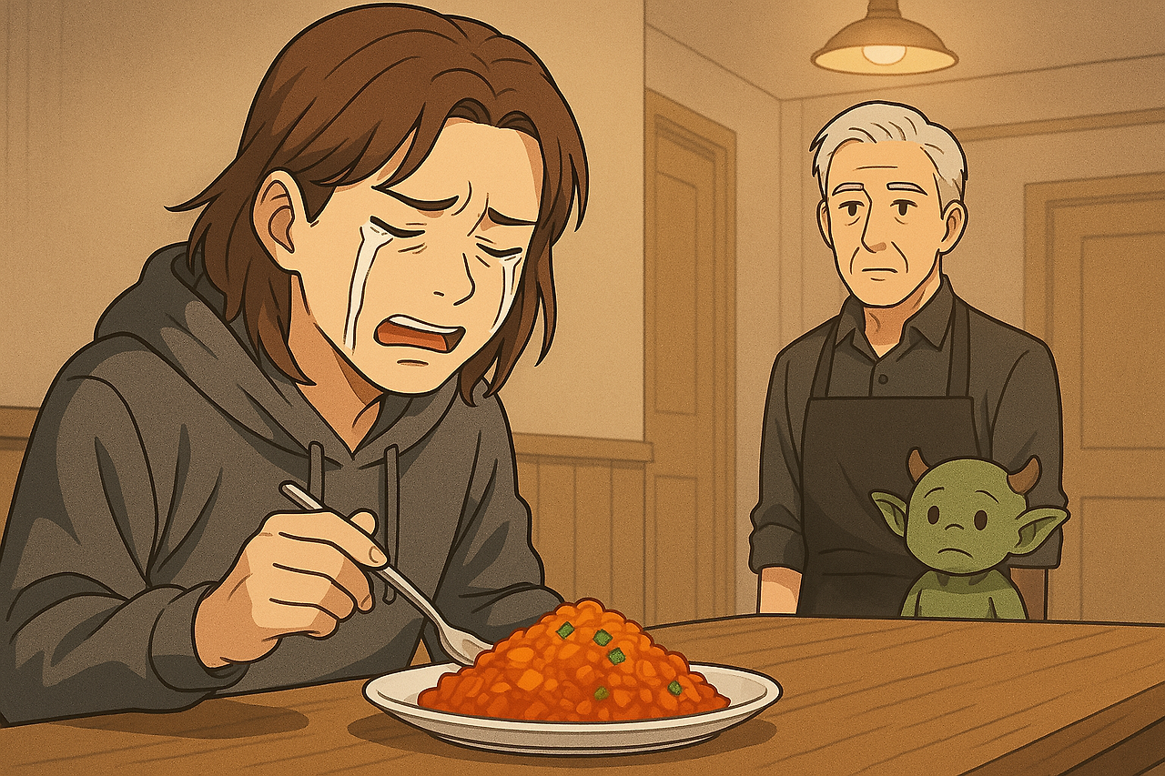 눈물 섞인 김치볶음밥을 숟가락으로 꾹꾹 떠서, 끝까지 남기지 않고 입에 넣었다.