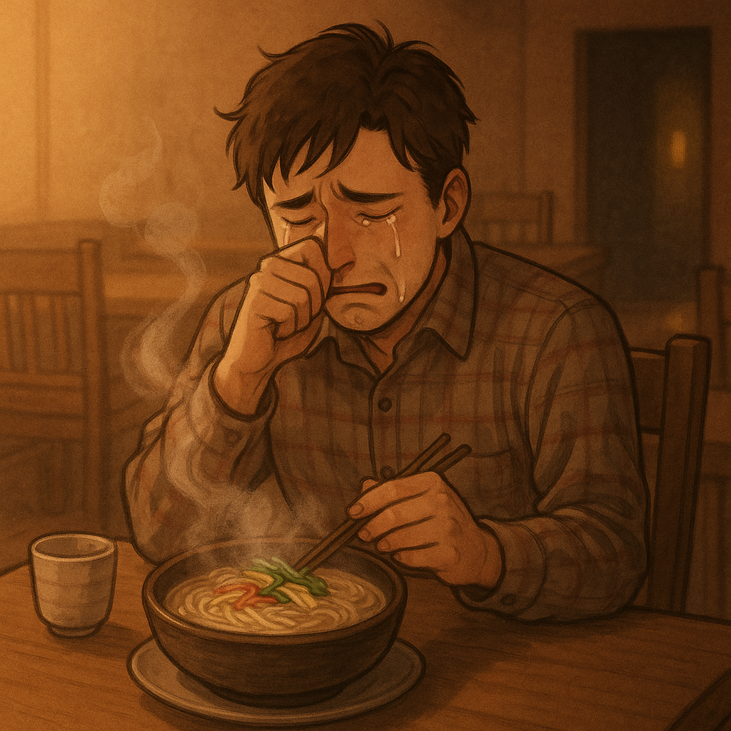 그의 잔치국수 육수는 그의 눈물로 줄어들 생각을 하지 않았다.