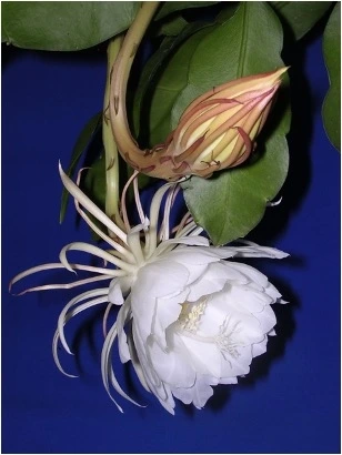 도대체 어떤 꽃이 길레, ‘아주 짧은 현상’을 나타내는 것인지 궁금하다! 나답지 않은 부지런함을 발휘하여 찾아봤다. 위키백과가 ‘에피필룸 옥시페탈룸(Epiphyllum oxypetalum), 즉 더치맨 파이프 선인장은 밤의 공주 또는 밤의 여왕으로, 멕시코에서 니카라과까지 자생하는 선인장 종입니다. 밤에 꽃을 피우고 새벽이 오기 전에 꽃이 시듭니다.’라고 보여줬다. 사진도 함께 보여줬는데, 참 정교하게 생긴 하얀 꽃이다.