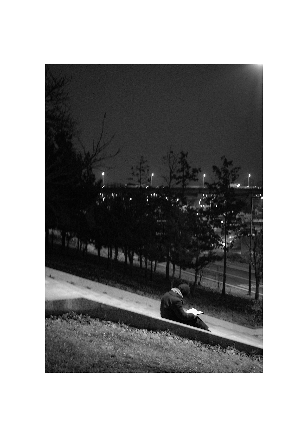 한강 둔치 어느 계단에 앉아 책을 읽는 이를 만났다.