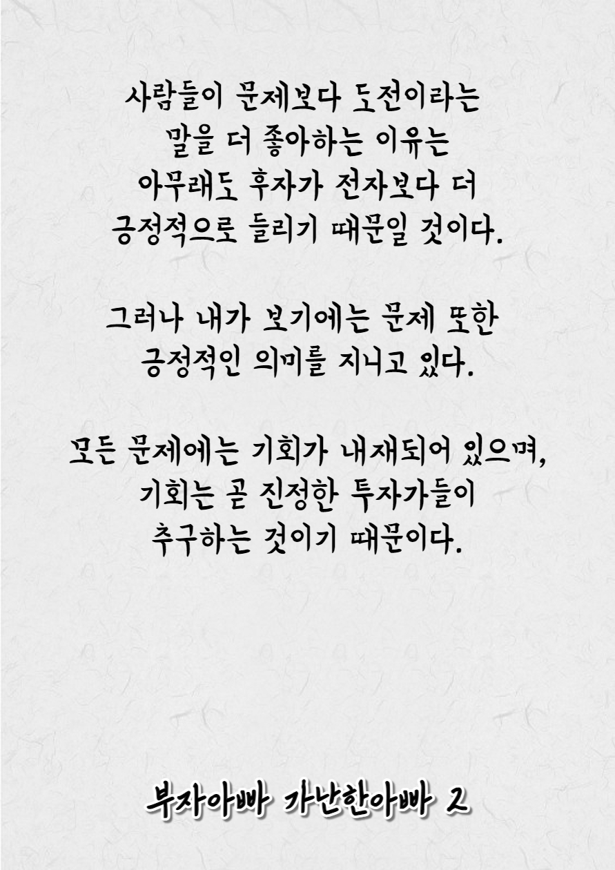 "너의 인생도 이번이 마지막 기회일 리는 없다. 분명히 앞으로도 몇 번의 기회가 더 찾아올 것이다. 그러나 나는 너희 부부가 이 기회를 잘 잡아서 빠르게 조기 은퇴를 하고 보다 자유롭고 가치 있는 삶을 누리기를 바란단다. 많은 고민을 해보고 방법을 잘 찾아서 시도하고 성취해 보거라."