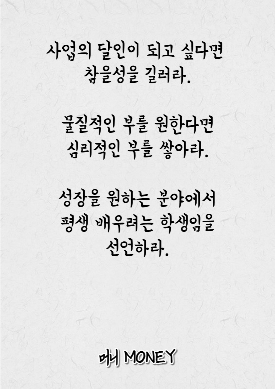 눈앞의 큰돈이 들이닥쳐도 흔들리지 않는 마음을 가지는 것이 어디 쉬운가? 이 돈을 어떻게 사용하면 더 큰돈이 될 수 있는지를 명확히 바라보는 혜안이 필요하다. 그 돈에 의해 관계가 무너지지 않으며 동시에 더 견고한 관계를 만들어 낼 수 있도록 말이다. 만약 내가 큰돈이 없다고 할지라도 마음의 부를 쌓아내는 것 또한 중요하다. 이 모든 과정이 모였을 때야 비로소 온전한 부의 각성이 될 것이다.