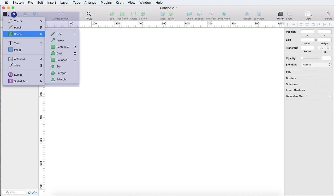 가장 많이 사용하게 되는 메뉴다. ‘Insert’메뉴를 통해 캔버스에 놓이는 모든 오브젝트에는 자동으로 레이어가 할당된다. shape, line, text 등의 기본 도구과 ‘Artboard’, ‘Slice’ 와 같은 고급 기능이 포함되어 있다.