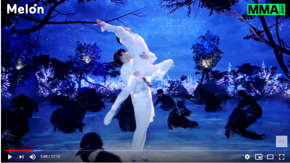 출처: 멜론 2020 MMA물이 고여있는 호수로 만들어진 무대에서 정국&지민, 진&RM, 제이홉&뷔가 쌍을 이뤄서 흑조들 사이에서 춤을 춘다. 수온이 낮지는 않았을까 이 추운 겨울에 우리 애들을 물에 젖게 하다니, 일순간 화도 났지만 너무 아름다운 화면에 애들 걱정은 금세 잊어버렸다(이런 얄팍한 팬심 같으니). 나중에 또 돌려보니 방탄도 대단하지만 뒤에서 받쳐주는 흑조들도 대단했다. 많은 사람들이 한 몸처럼 일사불란하게 움직이고 그 각을 맞춰야 하니 얼마나 애를 썼을까? 검은 옷과 마스크 뒤에 가려진 그들에게도 박수를 보낸다.