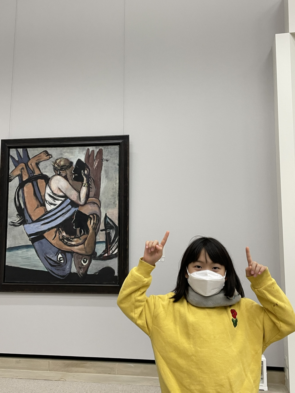 이 미술관에서 두 아이들이 모두 가장 좋았다고 꼽은 그림은 막스 베크만(Max Beckmann)의 <물고기와의 여정(Riese auf dem Fisch/Journey on the Fish,1934)>이었다. '사람들이 물고기를 타고 어디로 가는 궁 게 신기하고, 사람의 몸이나 물건의 테두리를 진하게 그려놓은 게 멋지다'라는 게 가장 좋은 그림으로 꼽은 이유였다. 사실 이 작품은 막스 베크만의 작품 중에서 가장 대표적이거나 유명한 그림은 아니다. 나는 심지어 막스 베크만이라는 이름도 이 날 처음 알았다.