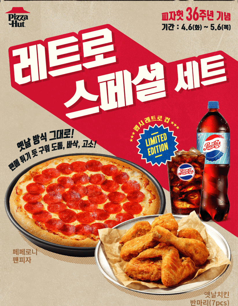 [파이낸셜뉴스 기사 발췌] 한국피자헛이 피자헛 36주년을 기념해 추억의 맛과 감성을 담은 '레트로 스페셜 세트'를 출시한다고 6일 밝혔다. 이번 세트 메뉴는 5월 6일까지 한 달간 선보인다.