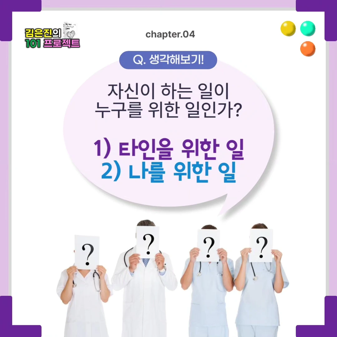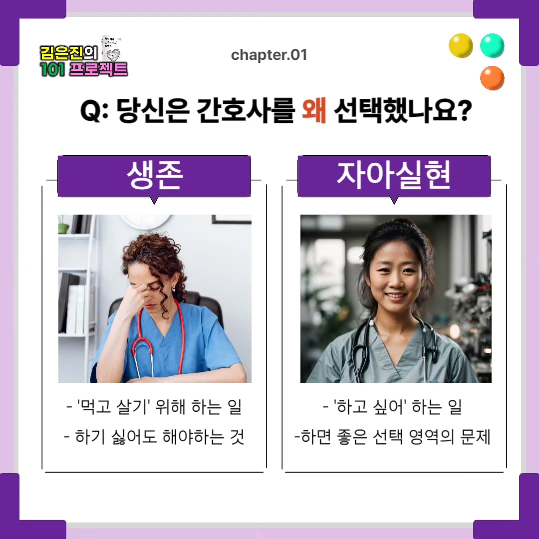 하루 하나 브랜딩 p.34를 보면, "생존과 자아실현"이라는 부분이 있어요. 우리가 간호사를 하는 이유가 혹시 생존 일지, 자아실현일지 진지하게 생각해 볼 필요가 있어요. 이러한 마음가짐이 간호사태움 문제와도 연결될 수 있기 때문이에요.