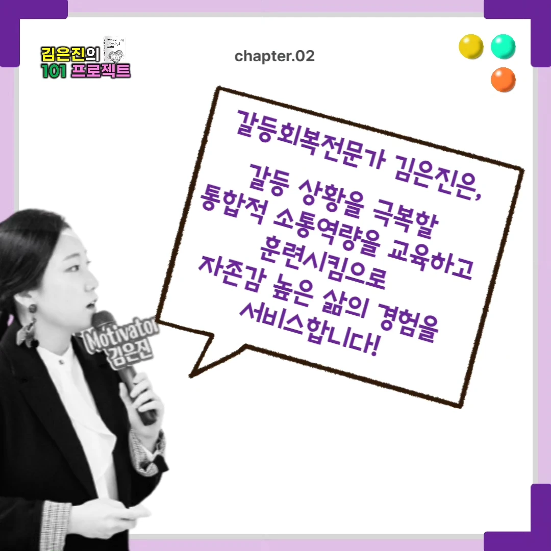 갈등회복전문가 김은진은 갈등 상황을 극복할 통합적 소통역량을 교육하고 코칭으로 자존감 높은 삶의 경험을 서비스합니다!