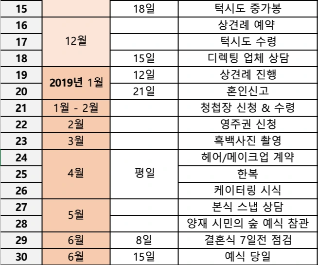 폐백은 하지 않을 것, 한복 사진은 찍지 않을 것, 양가 어머니의 한복은 빌릴 것, 스튜디오 촬영은 흰 배경에서 심플하게 하고 원본 및 수정본은 받되 앨범은 만들지 않을 것, 본식 사진과 꽃장식에 투자할 것, 예복은 미국에 가져갈 수 있도록 구매할 것 등등 큰 것에서부터 작은 것까지 끊임없이 생각했다.