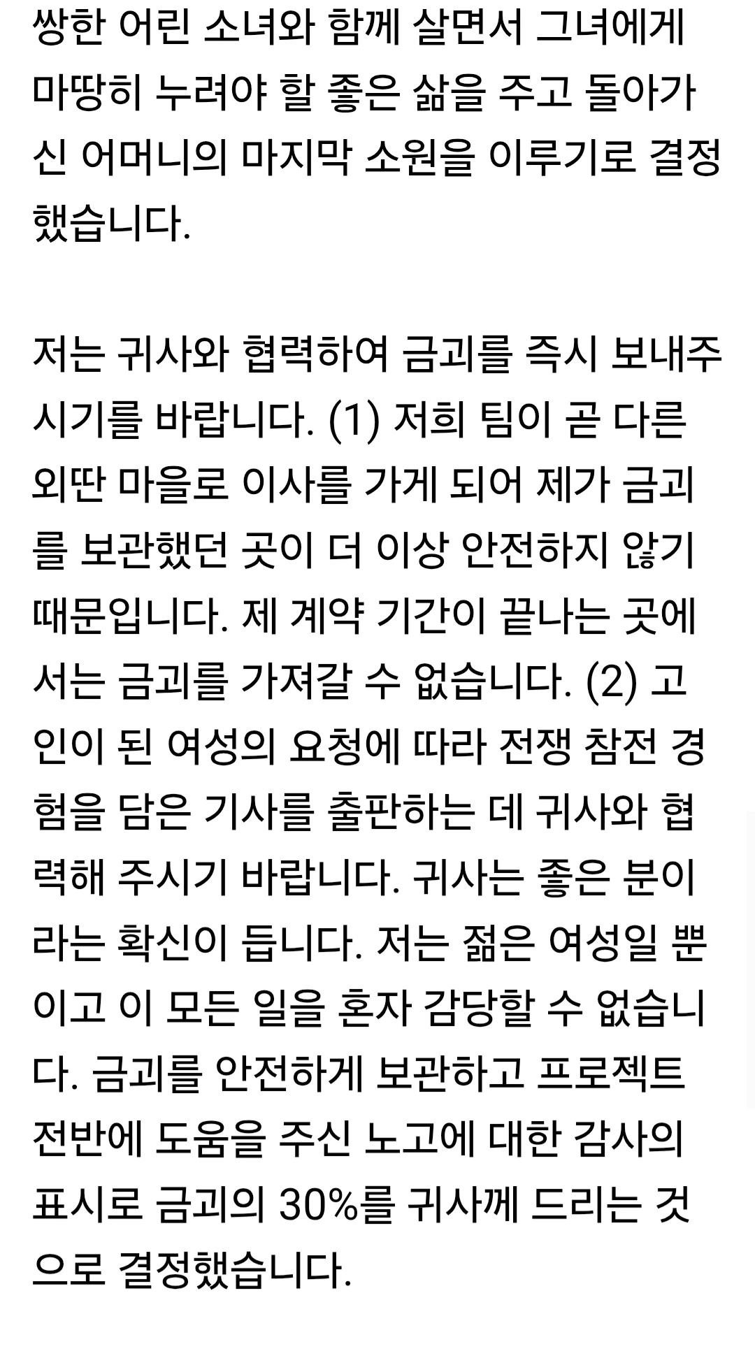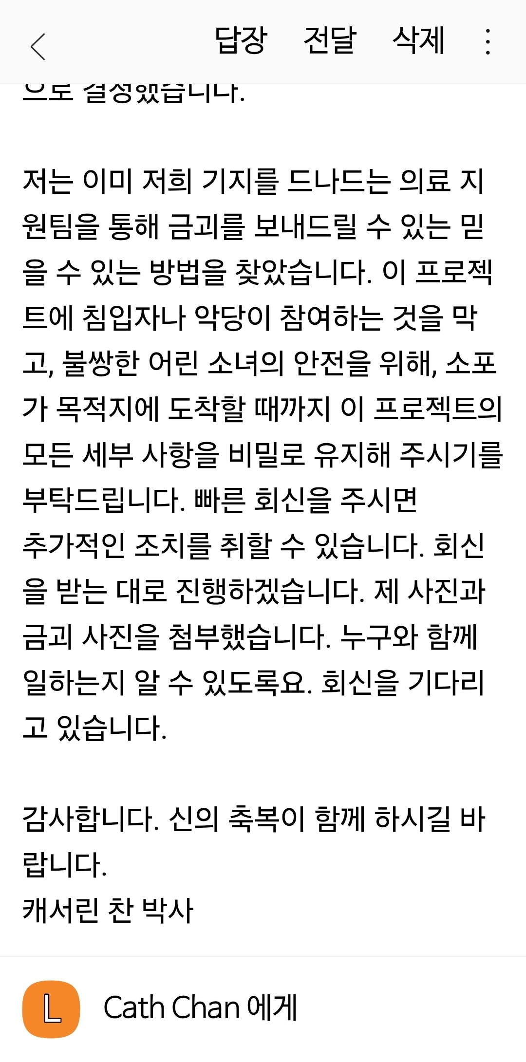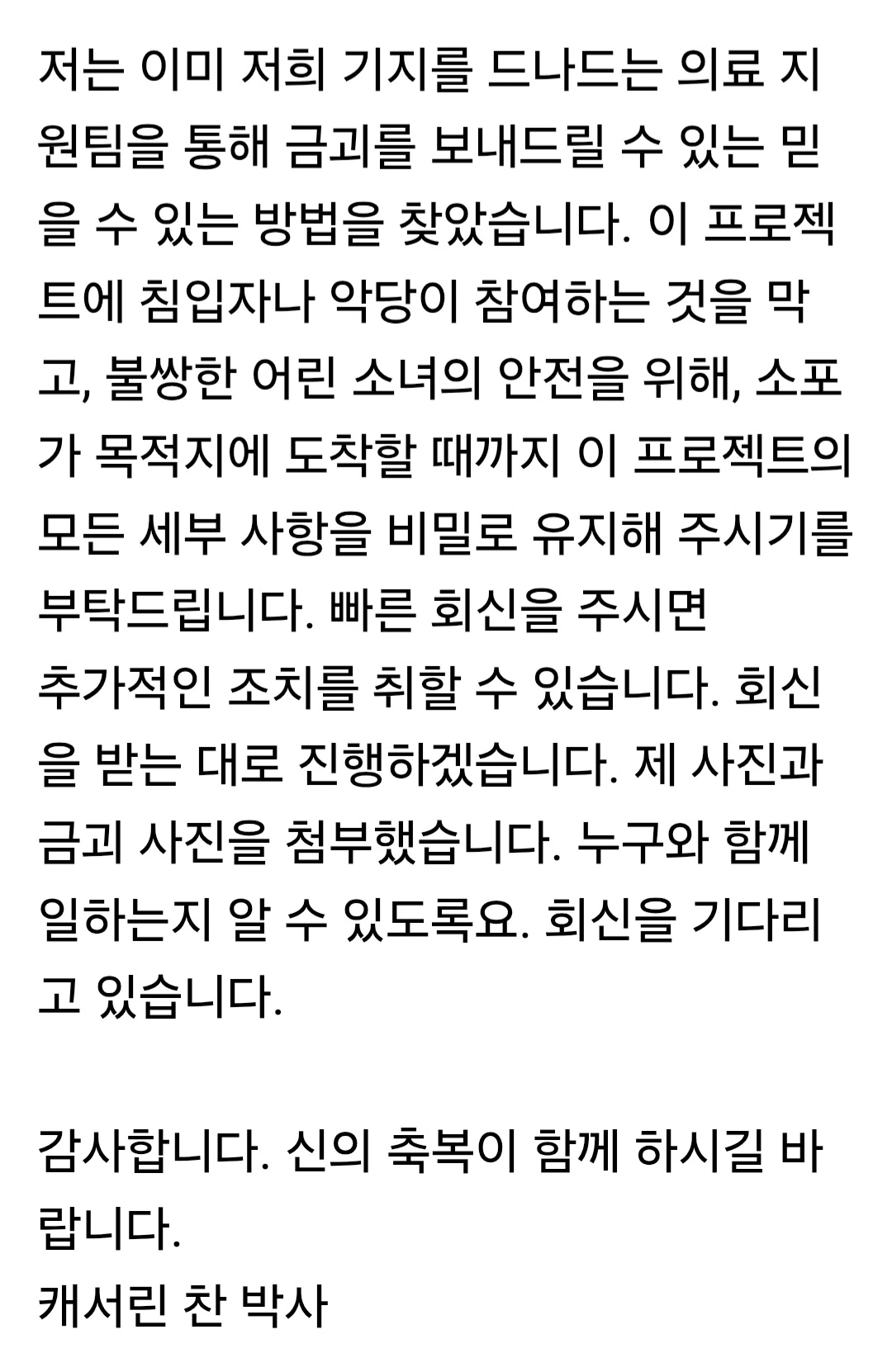 작가도 출판사도 아니라 의심은 했지만 처음이라 혹시나 해서 메일을 보냈더니 회신 메일이 우크라이나. 금괴. 수고비