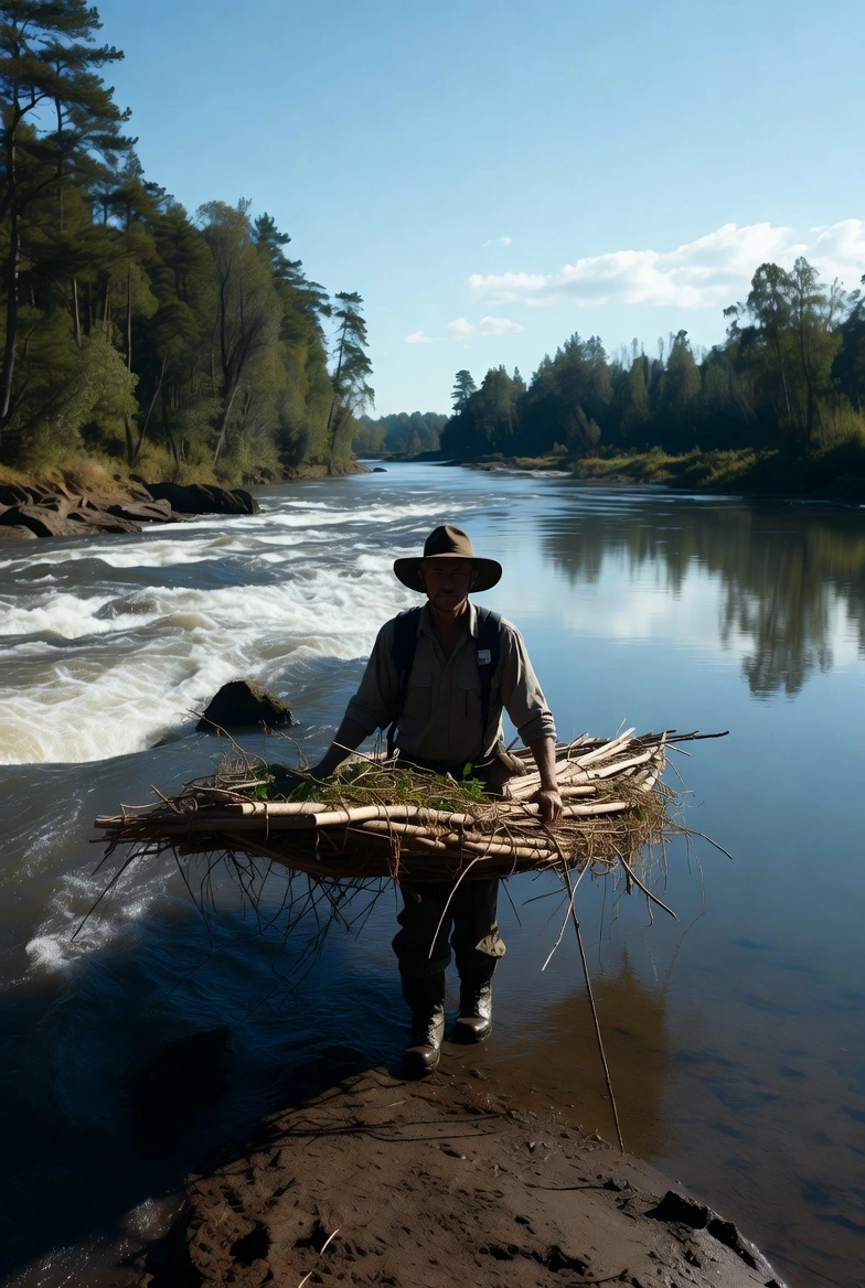 배도 교량도 없는 상황에서 여행자는 주변의 풀과 나무를 모아 뗏목을 정성껏 만듭니다.
