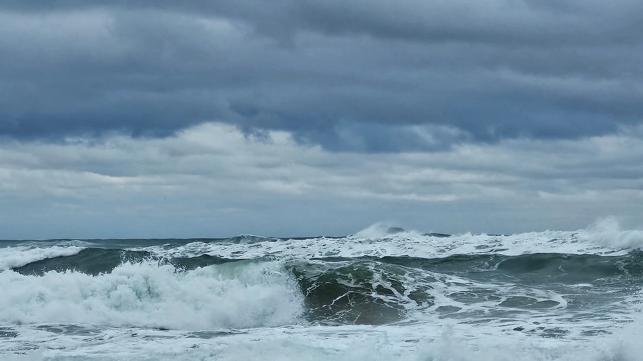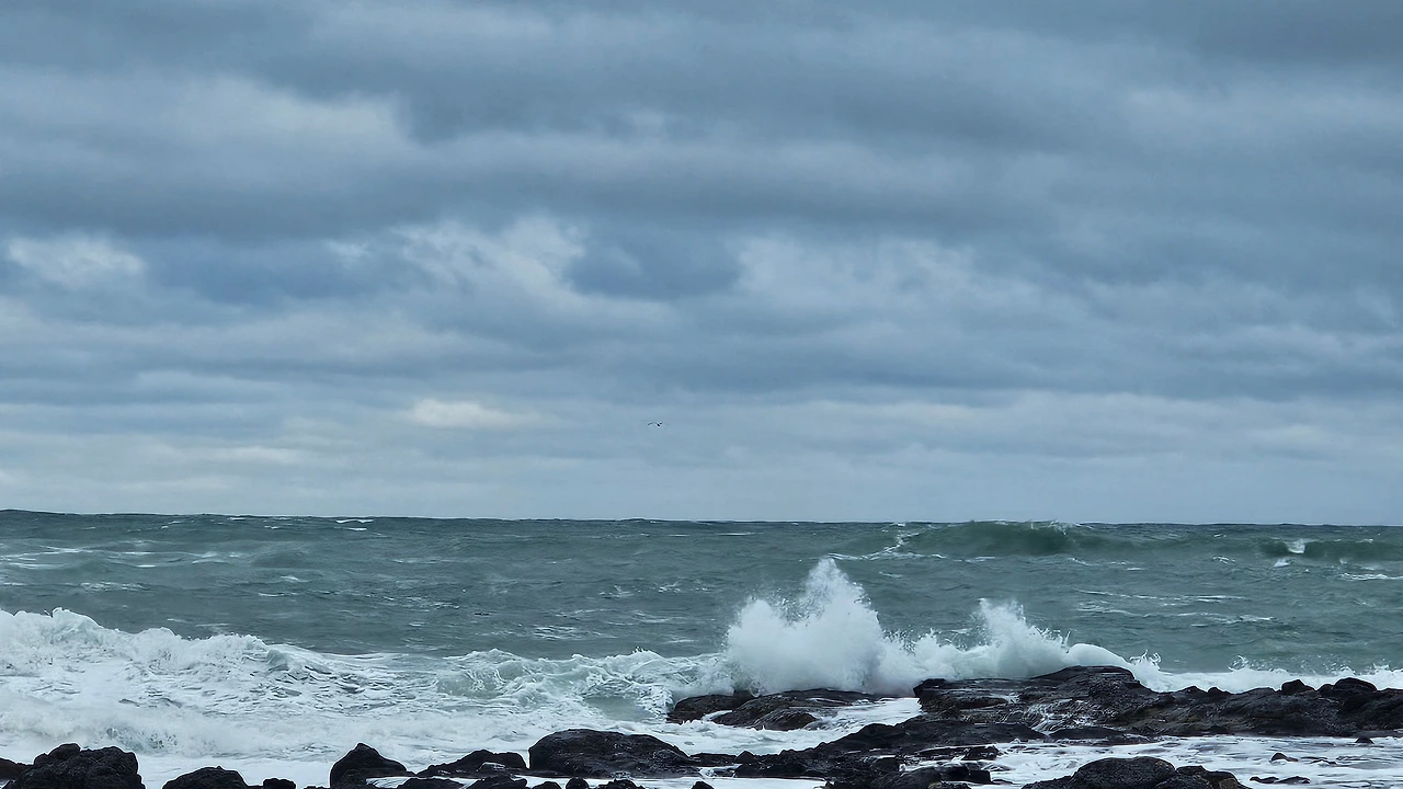 거센 파도가 쉴 새 없이 바위에 부딪치고 물결이 높게 일렁이며