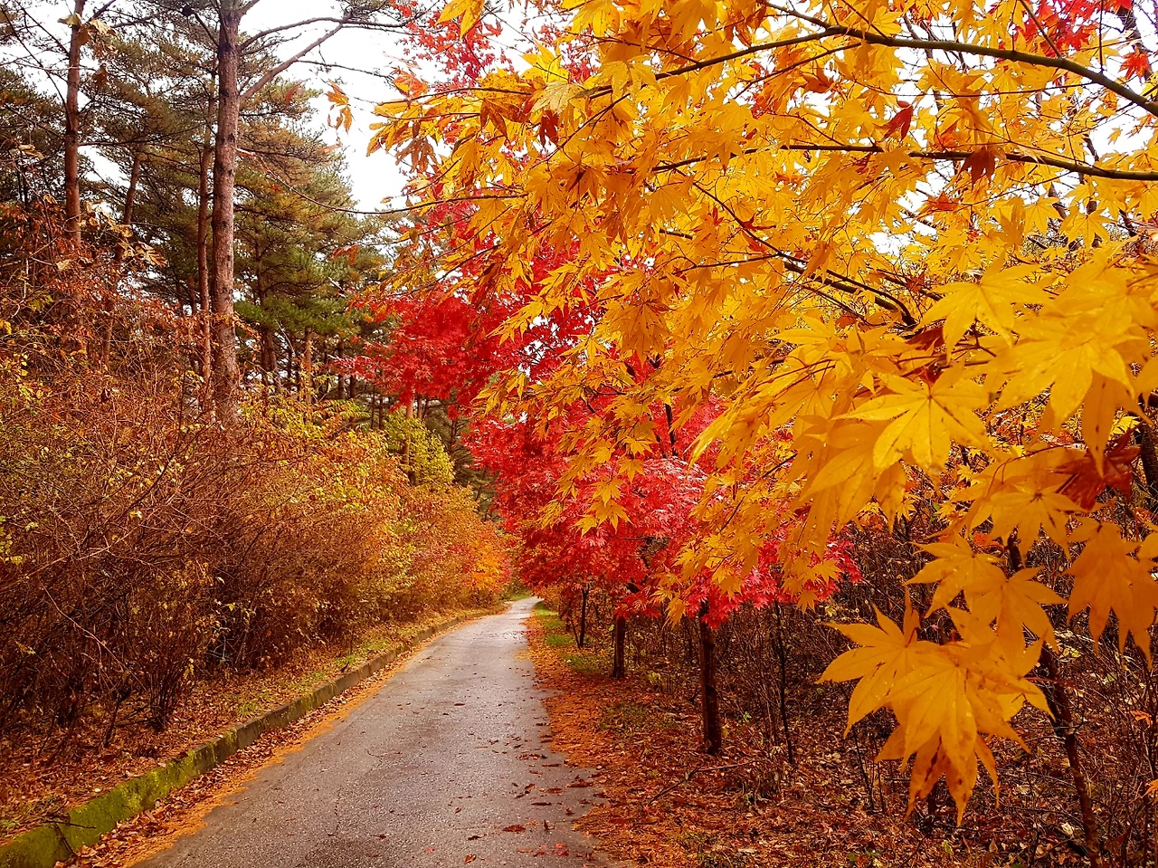 비가 그치고 가을이 짙어져 색깔도 예쁘다. 물감을 뿌려놓은 듯 도화지 위에 옮기고 싶다. 기온도 낮아 긴팔을 준비해야 할 시기가 왔다. 초록의 숲에서 잠시 멍하니서 주변 관찰하며 사진을 찍으며 하늘을 쳐다본다. 해가 빨리 지는 산촌 밤에는 음악회가 열린다.