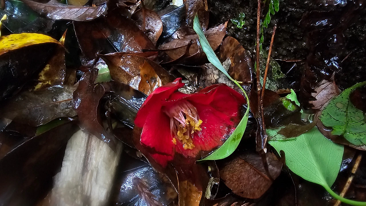 우중산행 중 발끝에 닿은 붉은 숨결 하나.