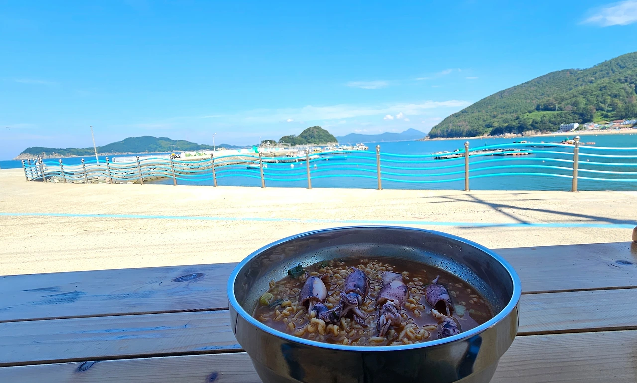스탬프를 찍고 돌아가기 전 가게에서 한치 라면을 먹었다. 10,000원 했지만 어렵게 온 만큼 먹어 보고 싶었다, 친절한 사장님이 한치 4마리 올려 주셨고 바다를 보며 맛있게 먹었다.