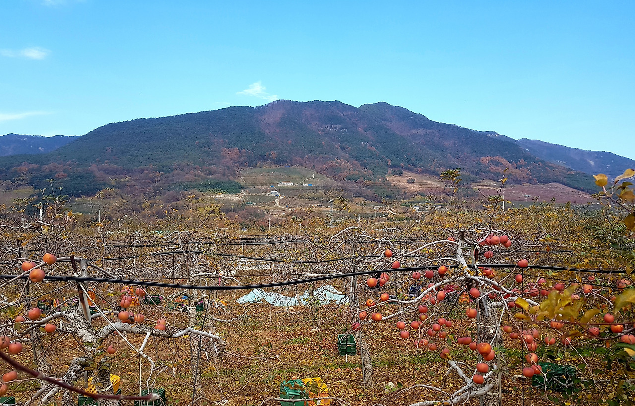 나머지 사과를 다 따고 다 함께 선별을 하니 저녁이 되었다. 집에 갈 시간이 되어 주변 경치에 눈을 돌리니 멋진 산이 있었고 노을이 지고 있었다.