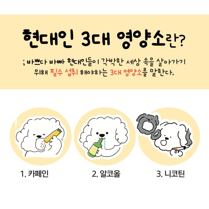나의 20대를 3가지 단어로 설명하라고 하면 카페인, 알코올, 니코틴이라고 할 수 있겠다. 20대의 나는 출근 전 통장잔고에 5,000원이 있어도 1,500원짜리 아이스 아메리카노를 사 먹는 사람이었다. 학교 수업이나, 회사를 퇴근하면 지인들과 하나 둘 모여 소주를 3~4병 마셨고, 그러다 틈틈이 술집 앞에서 하얀 연기를 내뿜곤 했다.