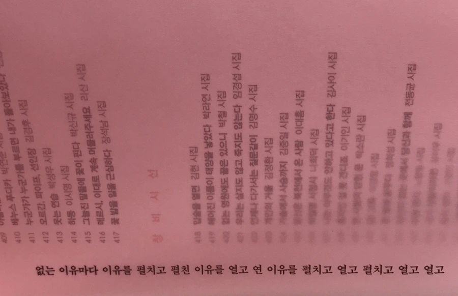 이 시집은 내가 좋아하는 따뜻함을 머금은 시들과는 결이 조금 다르다. 한 단어와 단어와의 관계와 결합, 또 배치에 따라 느낌이 어쩔 때는 상큼했다가, 또 어쩔 때는 흑빛이다가, 또 어쩔 때는 나른한 기분을 느끼게 하는 등 느낌이 아주 확연히 달라지는데, 이 시집은 단어들의 조화에 의한 효과를 잘 살린 느낌이 들었다. 작품들마다의 느낌, 분위기, 문체, 주제 등이 아주 다양하기에 전체적으로 이 시집은 어떠한 시 모음이라고 말하긴 어렵지만, 독특한 단어 배치로 신선함을 느끼게 하며 그 속에 우리의 일상을 담아 다양한 일상의 조각들을 보여주는 느낌이라는 생각이 들었다.