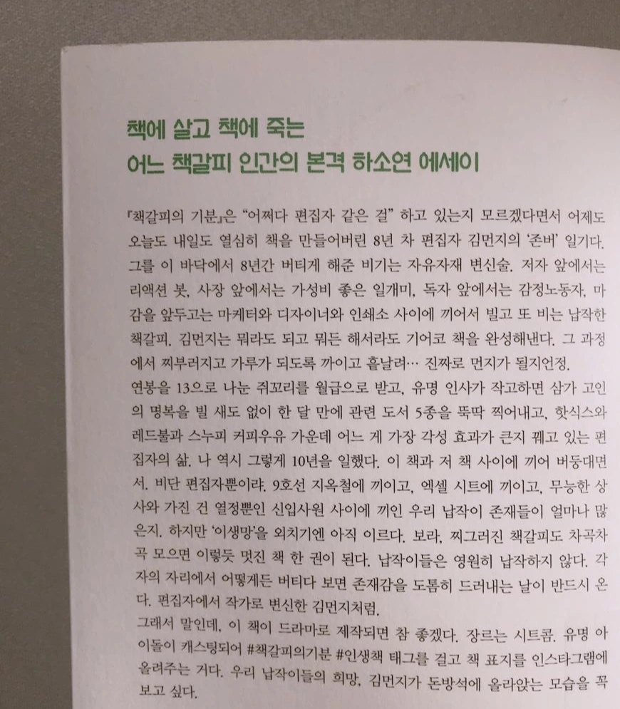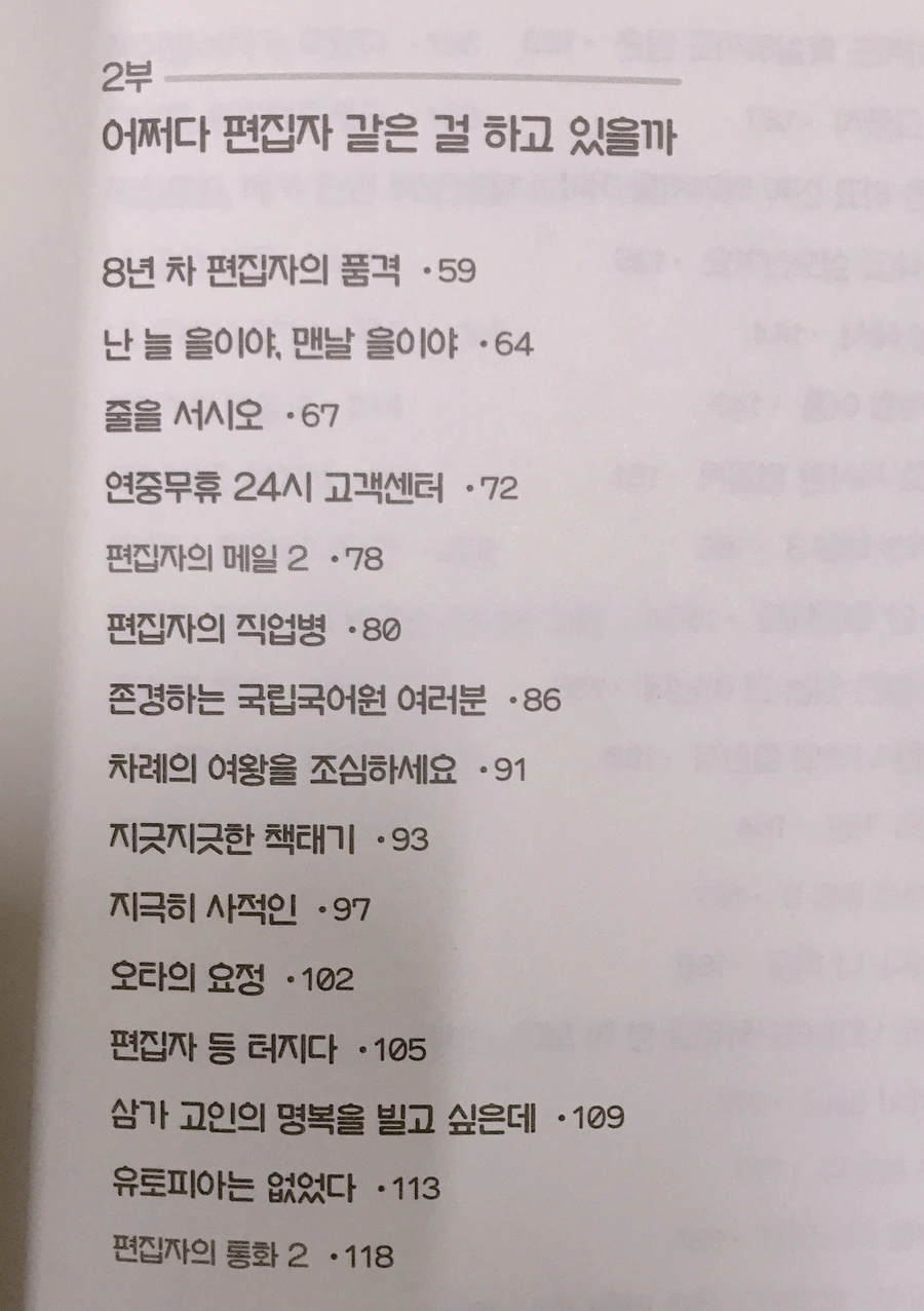 이 책은 정말 웃기다. 읽다가 나도 모르게 피식하게 되는 부분들이 많다. 출판 편집자답게 글을 잇는 게 자연스럽고 또 자연스럽게 부담 없이 재밌게 읽힌다. 하지만 마냥 재밌기만 하냐. 그건 또 아니다. 이 책은 웃기면서도 슬프다. 출판 편집자로서 8년. 긴 시간 동안 책 사이에 끼어 책갈피로 지낸 그녀의 출판 편집 일상은 슬프다. 그래서 웃프다.