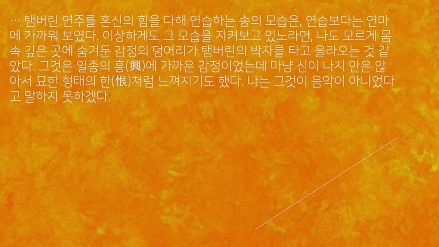 크기가 자그마한 탬버린은 만들기 쉽고 다루기도 편하다는 장점 덕분에 친근한 악기로 꼽힌다고 한다. 탬버린은 그저 손으로 리듬에 맞춰 치기만 하면 되는, 별도의 사용법을 알아야 할 필요가 없는, 강력한 장점덕분에 우리의 주변을 둘러싸고 있는 악기 중에서 가장 부담 없이 대할 수 있는 악기이지 않을까. 모든 탬버린의 종류와 크기, 재질은 각각 다르지만 야트막한 원형이나 반원, 또는 다각형 테에 파여진 홈에 금속으로 만들어진, 흔들면 찰찰 소리가 나는, 징글(jingle)이 달려있다는 사실만큼은 동일할 것이다. 우리들이 자주 찾는 노래방에서 아주 쉽게 볼 수 있는 탬버린은, 손으로 잡고 살살 흔들기만 해도 자신의 존재감을 소리로서 뽐낸다.