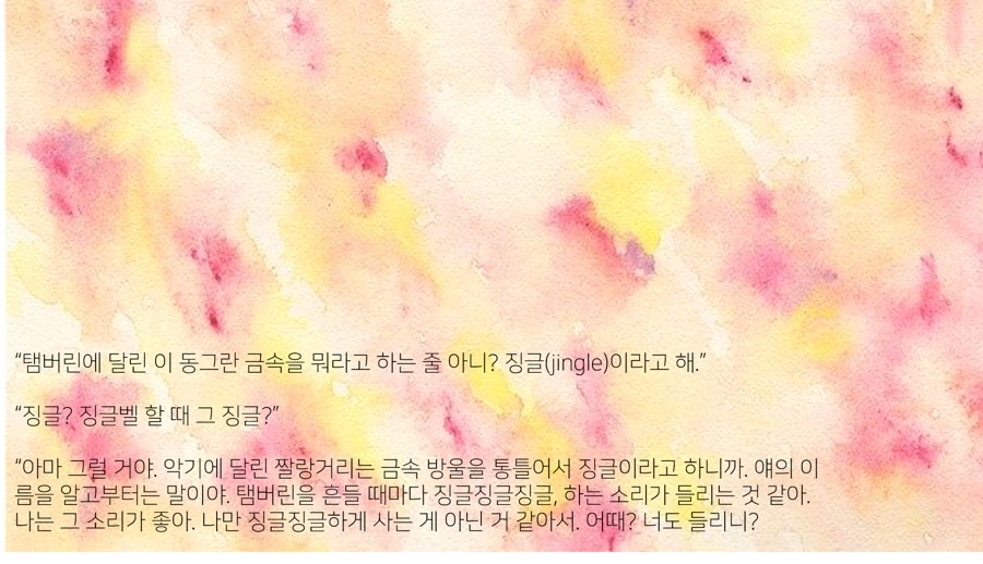 탬버린의 친근함과 편안함은 우리가 살고 있는 현실을 닮았다. 애석하게도, 삶은 그리 친근하지도 편안하지도 않지만, 우리 주변에서 쉽게 마주할 수 있다는 특징에서 우리가 살고 있는 현실을 닮았다. 이러한 탬버린에 달린 작은 금속인 징글(jingle)은, 우리의 삶을 소리로써 보여주는 듯하다. 송의 말처럼, 삶은 징글징글, 정말 징글징글징글하다고.