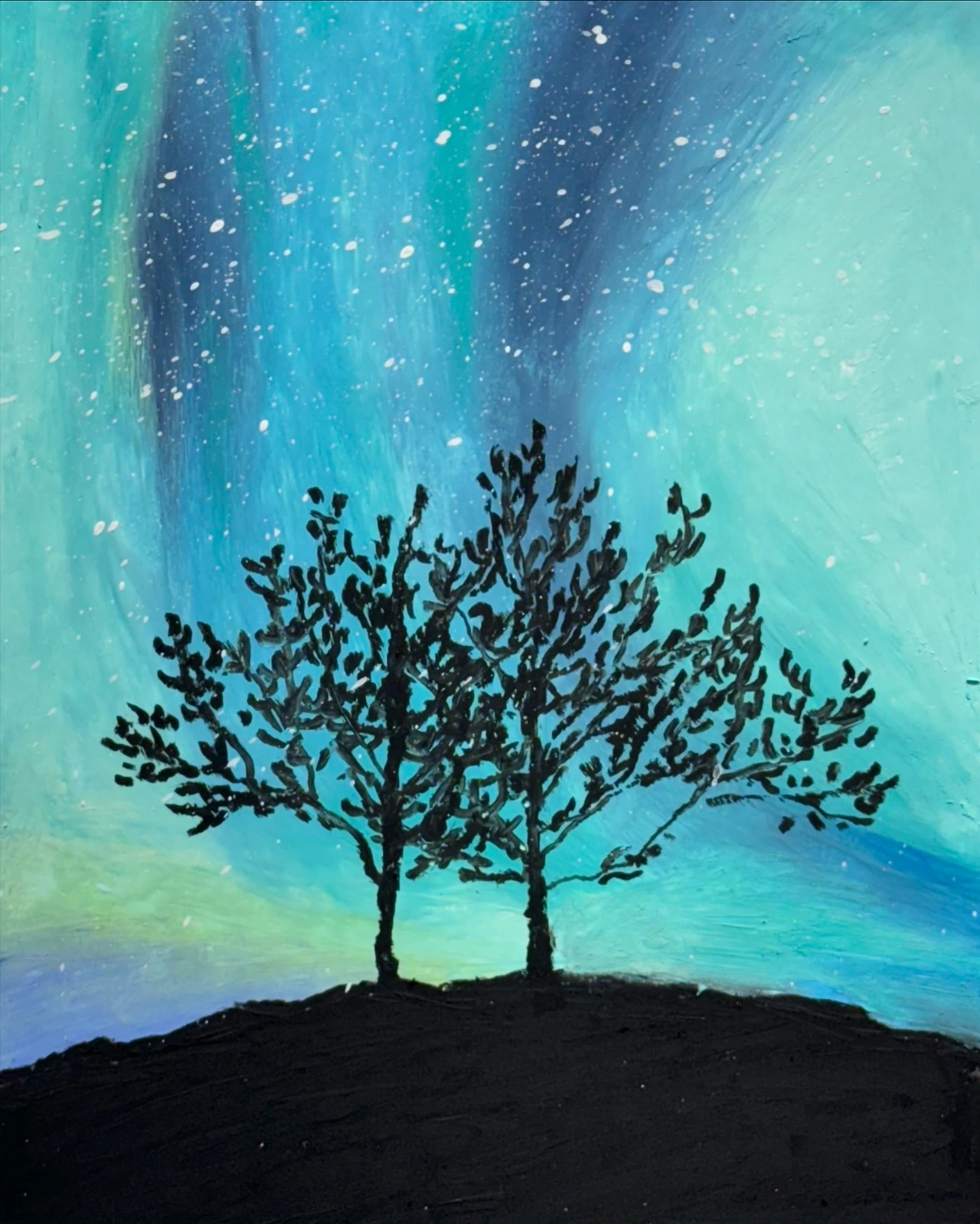 오로라를 그릴 때 하늘 외의 물체들은 무채색으로 그려주는 것이 좋다. 그 이유는 수놓은 듯한 하늘의 화려한 색감을 돋보이게 해 주기 위해서이다. 예시의 그림은 검은색을 사용해 밤에 어둡게 보이는 나무와 땅을 그려보았지만, 하얀색으로 눈이 내린 언덕을 그린다거나 설산을 그려주는 것도 분위기 연출에 도움이 될 것이다.