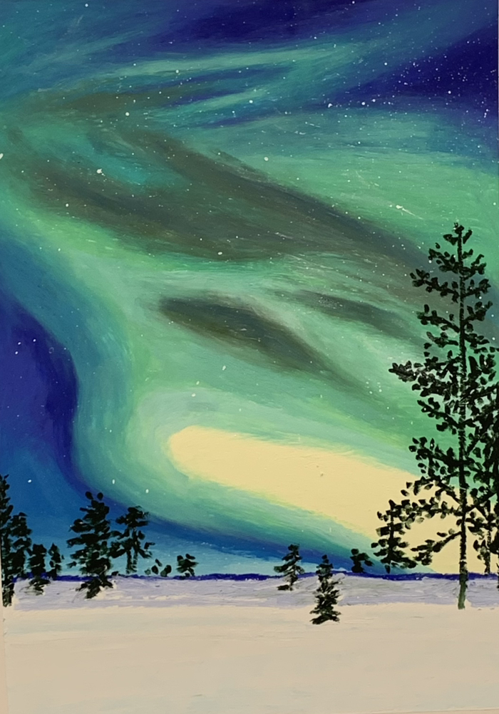 오로라와 핑크빛 하늘을 그리는 일이 파란 하늘 그리기보다 어려운 이유는 채도가 강한 높은 두 색을 적절히 블렌딩해야 하기 때문이다. 영롱한 오로라의 보랏빛과 민트빛 그리고 블루 컬러를 자연스럽게 섞는 일은 그리 쉬워 보이지 않는다. 파아란 하늘에 아름답게 물든 핑크빛 색상도 마찬가지이다. 그러나 상대적으로 파란색에서 하늘색까지 연결되게 그리는 것은 쉬워 보일 것이다. 단계에 따라 짙고 연한 정도만 다르게 표현하면 되기 때문이다.