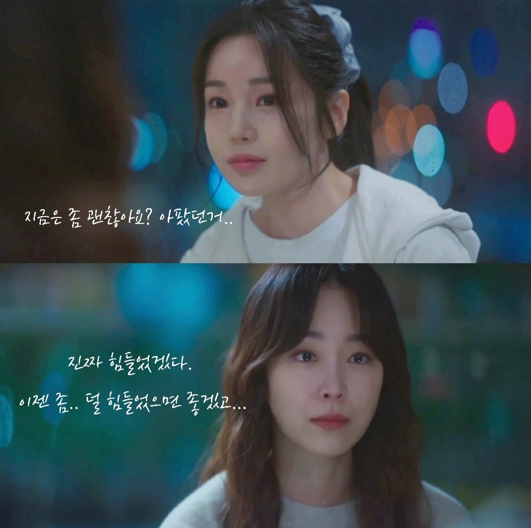 가영: 뭐 다 물어봐요~ 다정 : 지금은 좀 괜찮아요? 아팠던 거.. 가영 :... 다정 : 진짜 힘들었겠다. 이젠 좀.. 덜 힘들었으면 좋겠고...