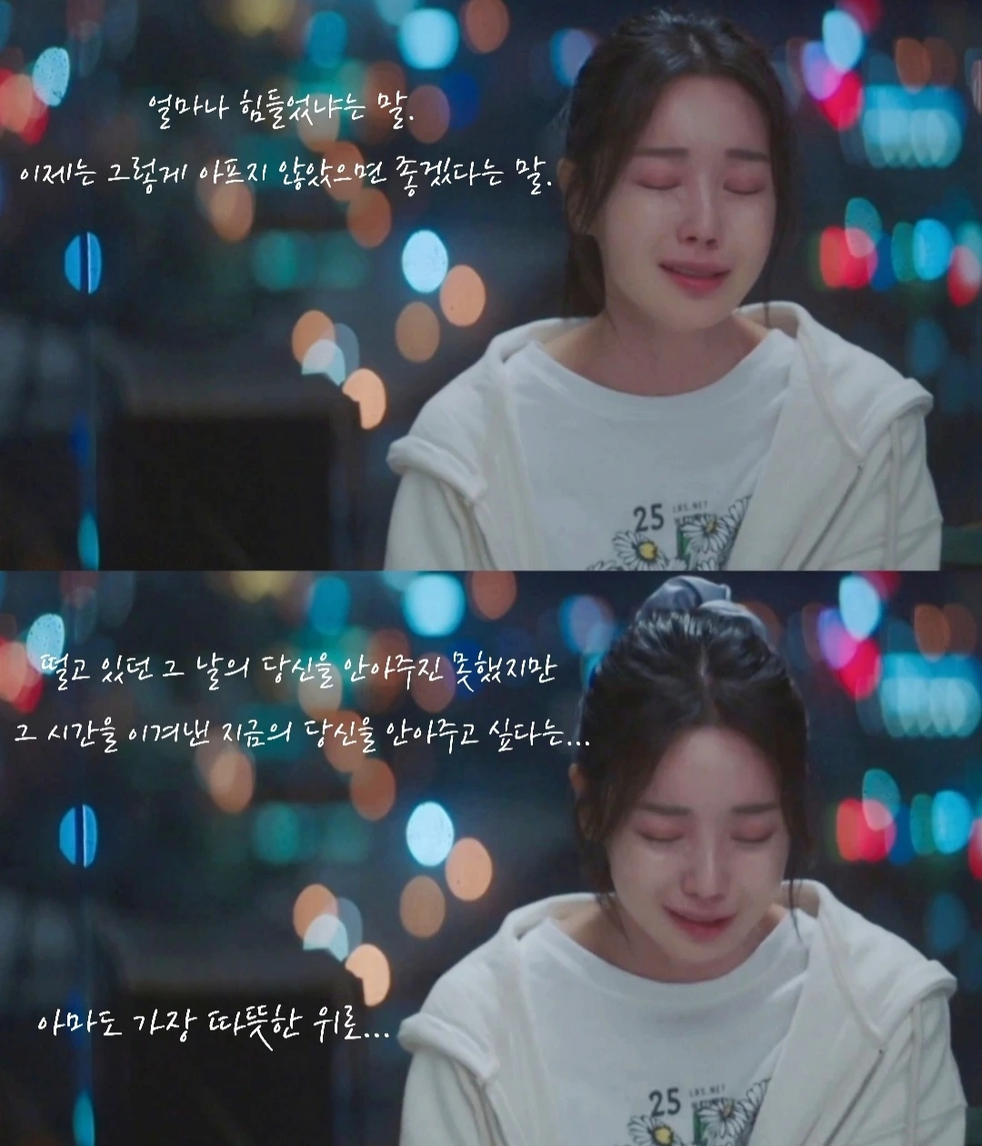 (영도의 내레이션) 얼마나 힘들었냐는 말. 이제는 그렇게 아프지 않았으면 좋겠다는 말. 떨고 있던 그날의 당신을 안아주진 못했지만 그 시간을 이겨낸 지금의 당신을 안아주고 싶다는... 아마도 가장 따뜻한 위로...