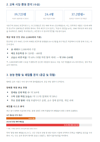 방배동 2,000세대 이상 신규 입주 아파트 주변의 초등생 위주 학원 분포와 교육열 데이터를 분석해 줘. 특히 반경 500m 내 수학교습소의 개수, 최근 폐업률, 그리고 해당 단지의 예상 학생 유입 비율을 기반으로 수학교습소 창업의 수익성을 리포트로 만들어줘.