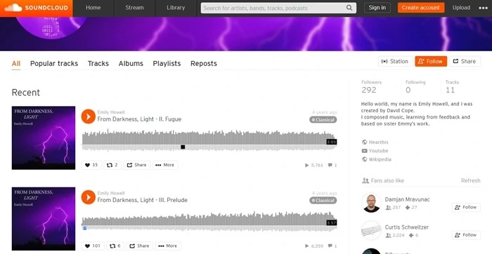 음악 분야의 AI는 미술보다 훨씬 오래되었다. 미국 UC산타크루즈 대학교 데이비드 코프 교수진이 1990년대부터 오랜 시간 공들여 개발한 AI작곡가 ‘에밀리 하웰’(Emily Howell)이 대표적인 예다. 에밀리 하웰은 모차르트, 베토벤, 라흐마니노프 등 여러 위대한 작곡가들의 작품을 학습했고, 이를 토대로 화음, 박자 등 수많은 요소를 조합해 새로운 음악을 창조해냈으며, 2010년에는 첫 디지털 싱글 앨범을 발매하기도 했다.