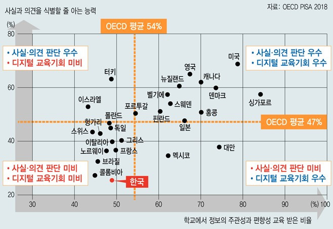 한국 청소년들의 디지털 리터러시는 경제협력개발기구(OECD) 국제학업성취도평가(PISA)에서 바닥권이다. 학교에서 인터넷 정보의 편향성 여부를 판단하는 교육을 받았다는 비율도 OECD 평균에 못 미치는 것으로 나타나, 학생들을 대상으로 한 디지털 리터러시 교육의 강화가 필요하다. 경제협력개발기구에서 2021년에 발표한 <피사(PISA) 21세기 독자: 디지털 세상에서의 문해력 개발> 보고서에서 한국의 만 15살 학생(중3, 고1)들은 사기성 전자우편(피싱 메일)을 식별하는 역량 평가에서 경제협력개발기구 국가들 중 가장 낮은 수준을 기록했다. 또한 한국 학생들은 주어진 문장에서 사실과 의견을 식별하는 능력에서도 최하위를 기록했다. 경제협력개발기구 회원국들의 평균 식별률이 47%인데, 한국 학생들은 25.6%에 그쳐 꼴찌였다. 이와 관련이 깊은 “정보가 주관적이거나 편향적인지를 식별하는 방법에 대해 교육을 받았는가”를 묻는 조사에서도 한국은 폴란드·이탈리아·그리스·브라질 등과 함께 평균 이하의 그룹에 속해, 학교에서 디지털 리터러시 교육이 제대로 이뤄지지 않고 있음이 밝혀졌다. 이 문항에서 경제협력개발기구 회원국 평균은 54%인 데 비해 한국은 절반 이하(49%)로 나타나, 평균보다 낮았다. 오스트레일리아·캐나다·덴마크·미국 등에서는 70% 이상의 학생들이 정보가 편향되어 있는지를 판단하는 교육을 받았다고 응답했다.