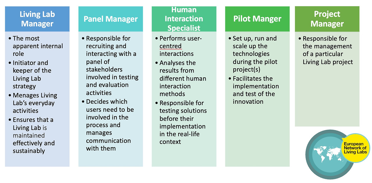 리빙랩 메니저: 리빙랩 프로젝트에서 가장 큰 내부 역할자. 리빙랩전략의 개발 수립하고 관리. 매일의 리빙랩 활동을 관리하고 리빙랩의 효과와 지속가능성을 지켜나가는 사람
