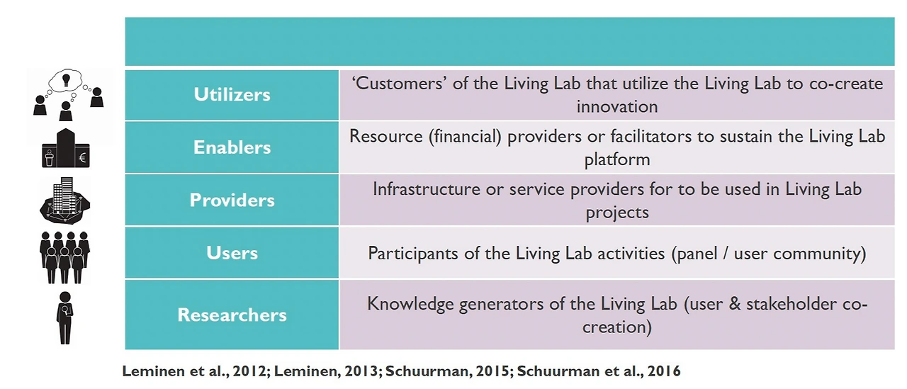 1. 이용자(Utilizer): 문제를 해결하고 혁신을 만드는 공동작업의 결과물인 리빙랩을 이용하는 리빙랩 고객(customer). 리빙랩서비스에 대가를 지불하거나 서비스를 제공받는 사람. 시민