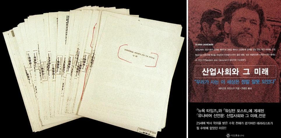 지난 6월 10일, 미국의 수학자이자 반기술주의자인 시어도어 존 카진스키(Theodore John Kaczynski)가 죽었다. 본명보다 유나바머(Unaboomber)라는 이름으로 더 많이 알려진 카진스키는 17년간 16번의 폭탄 테러를 통해 3명을 살해했으며 23명에게 부상을 입혔다. 과학기술의 발전과 산업화로 인류의 존엄성과 자율성이 박탈당하고 종국엔 말살당할 것이라는 자신의 신념에 입각해 과학자와 기업가들을 상대로 폭탄테러를 저질렀다.