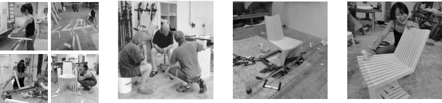의자 만드는 과정들. 선생님들이 내 의자의 자립성과 안정성에 대해 회의 중. 사실 나도 의자가 세워질 수 있을지 걱정이 많았다.
